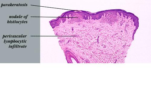 with few to many histiocyte-macrophages that stain with CD68, as well as epidermal Langerhans cells and indeterminate cells that express S100 protein. CD4+ cells predominate over CD8+ T lymphocytes. Many cells in the infiltrate express HLA-DR antigen, which implicates them as antigen-presenting cells.