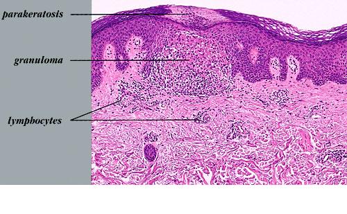 years.The co-existence of both diseases in some patients and the observation that the discrete, tiny papules of lichen planus are indistinguishable from those of lichen nitidus were used to support the view that lichen nitidus is a variant of lichen planus. However, most experienced clinicians, as well as research studies, favor the separation of these two diseases as distinct entities based on both clinical and immunodermatopathologic differences and the characteristic and distinctive histologic changes.. Another etiologic theory of lichen nitidus proposes that an allergen may cause epidermal and dermal antigen-presenting cells (e.g., Langerhans cells) to activate a cell-mediated response, initiate lymphocyte accumulation, and form discrete inflammatory papules. The presence of large numbers of Langerhans cells in the infiltrate supports this theory. Specific cytokines produced by the inflammatory cells influence the immune response and may shift the T lymphocyte response toward the T helper 2 subset that has the potential to produce the superficial dermal granulomas seen in lichen nitidus.6Functional impairment in cellular immunity has been reported in generalized lichen nitidus,7 and lichenoid photoeruptions similar to lichen nitidus were seen in a patient with HIV infection. Rare cases of lichen nitidus associated with atopic dermatitis, Crohn disease, and juvenile chronic arthritis have been reported. Induction of allergic contact dermatitis by topical application of dinitrochlorobenzene in a patient with lichen nitidus cleared the eruption, presumably by altering the cellular immunity, cellular infiltration, and cytokine expression.