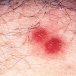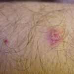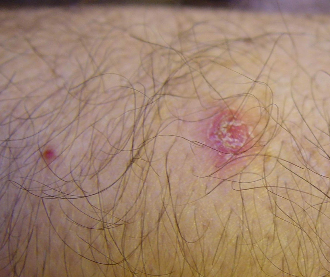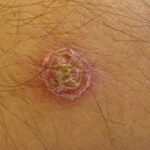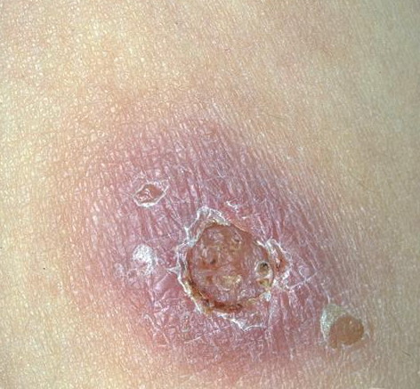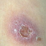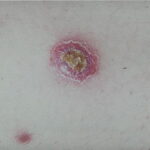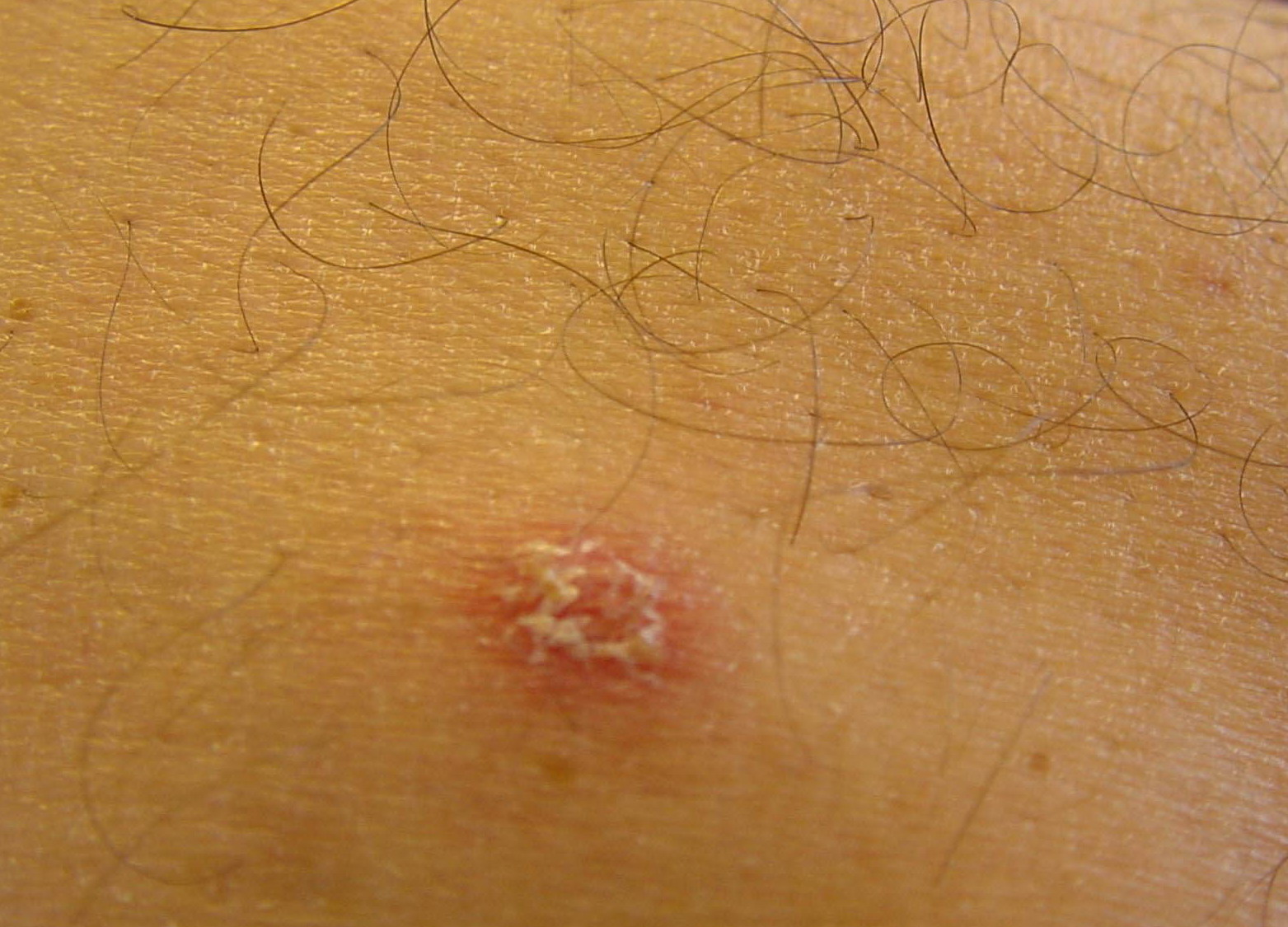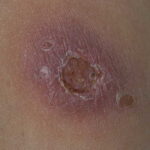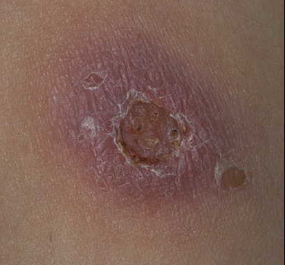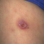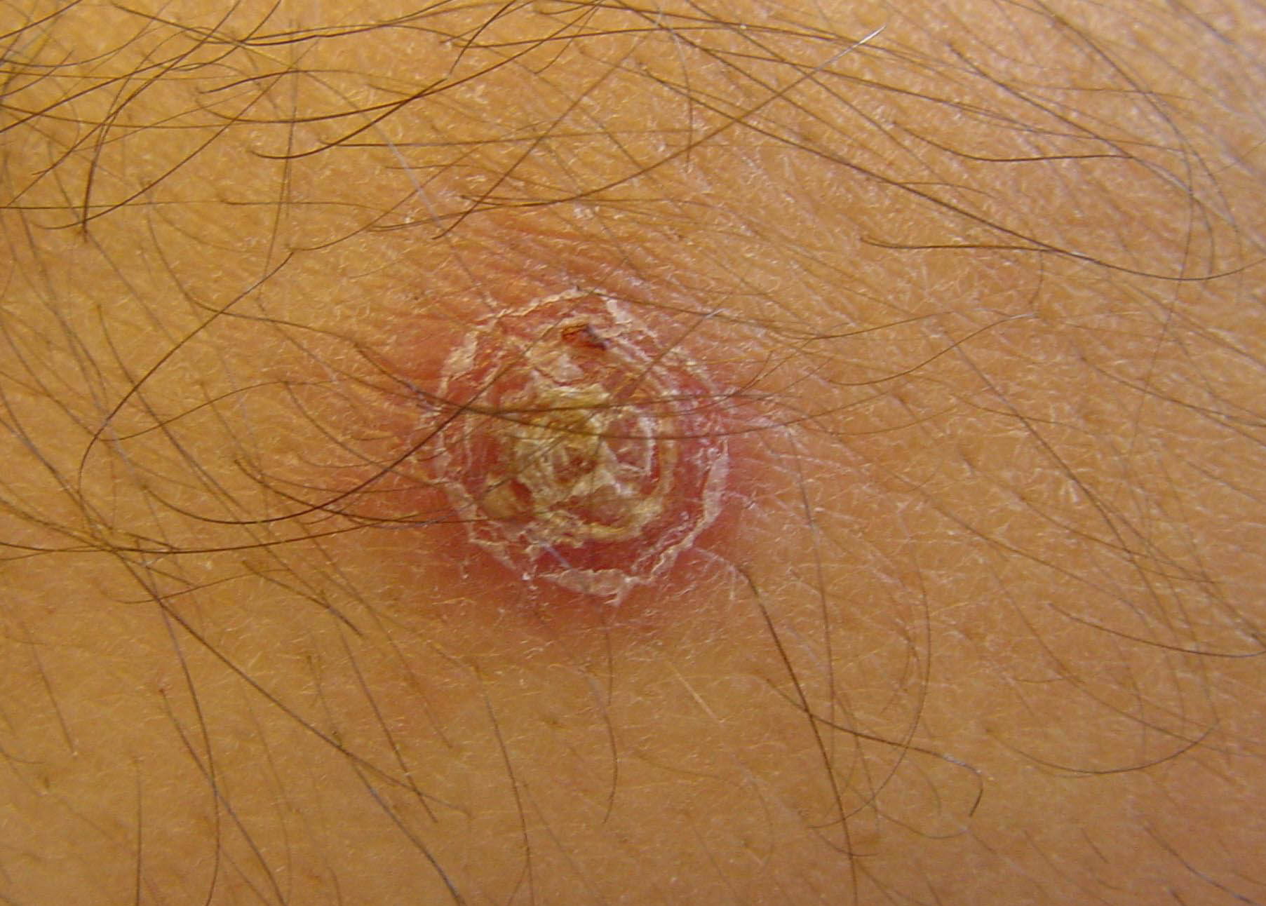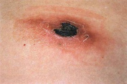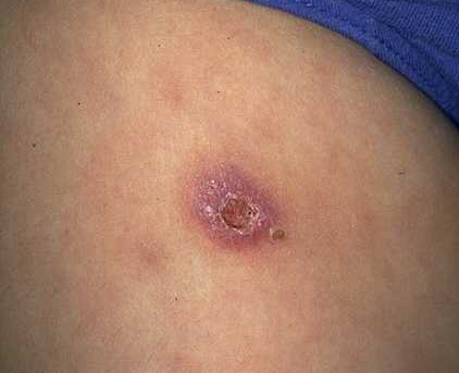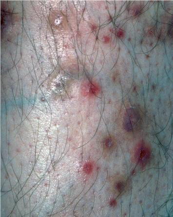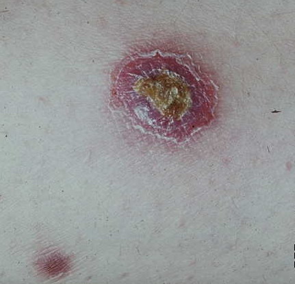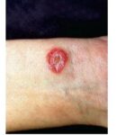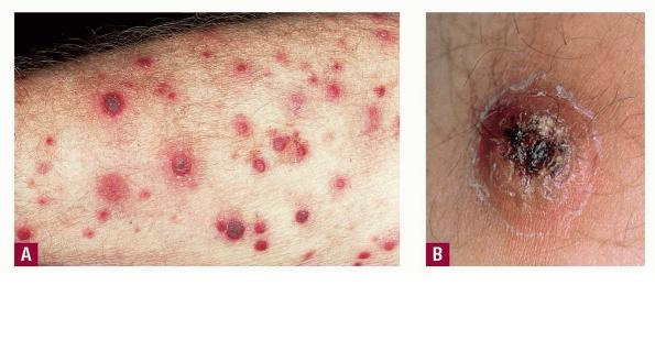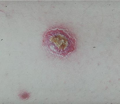 o Some lesions develop a necrotic eschar before healing spontaneously. Occasionally, noduloulcerative lesions may be present, as in the image below.
