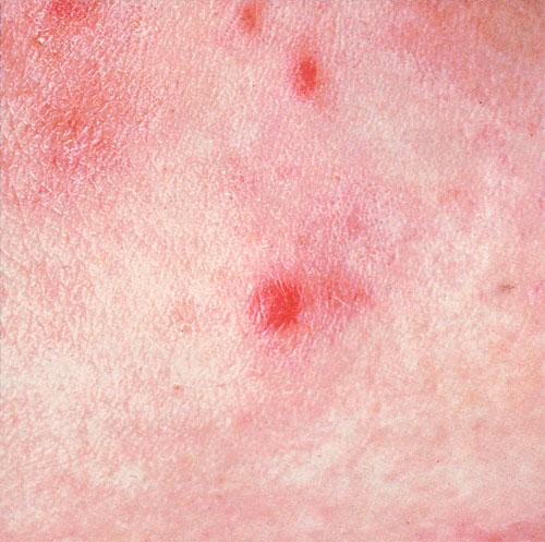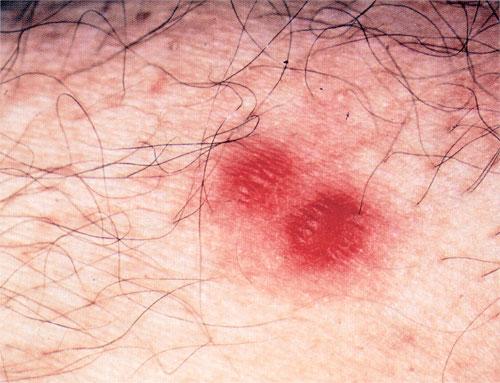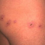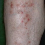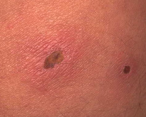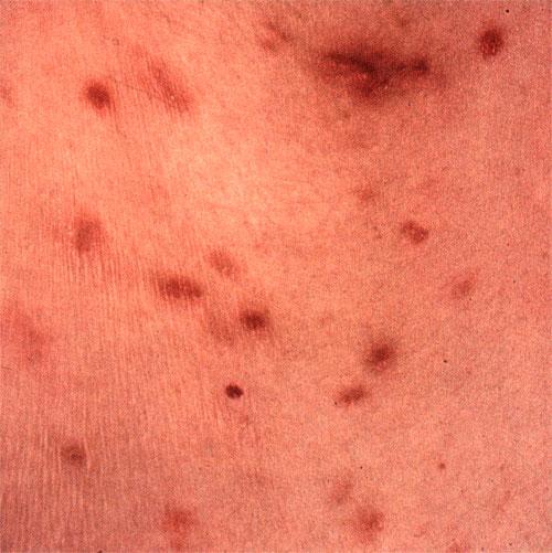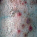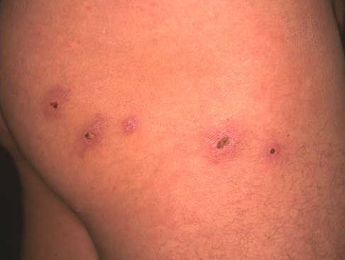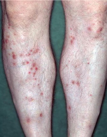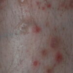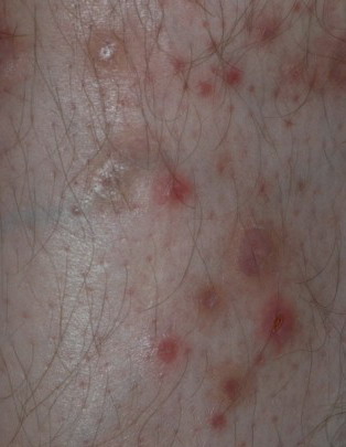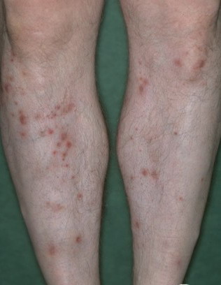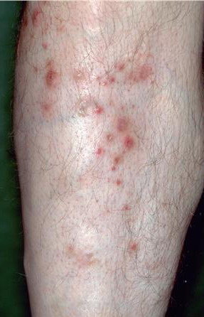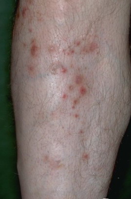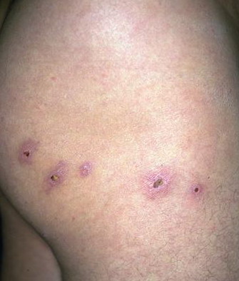 o Each erythematous papule evolves into a red-brown, often hemorrhagic, papulovesicular or papulopustular lesion over days to weeks, as demonstrated in the images below.
