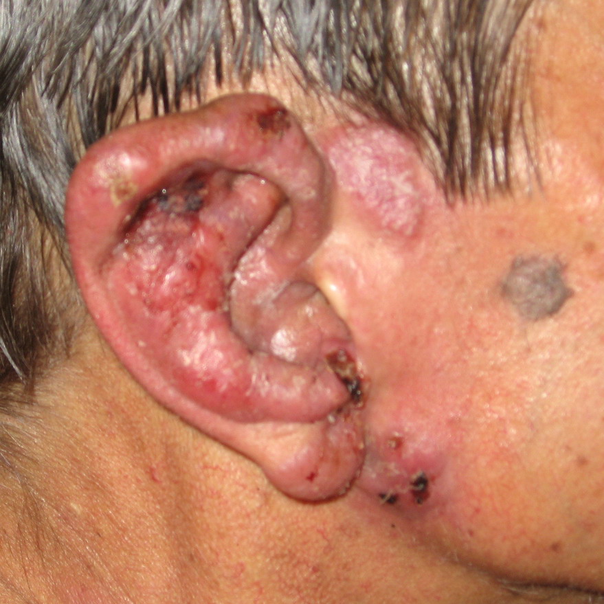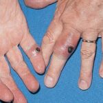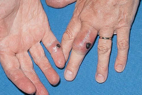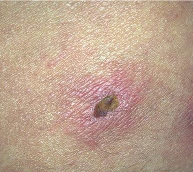 • Evolving lesions have been described under dermoscopy. The initial papular lesion showed a vascular pattern of tortuous vessels radiating from the center. A white structureless area was seen around the vessels. More mature lesions, hyperkeratotic papules, looked similar except the vascular pattern in the center of the lesion was obscured. As the lesions progressed to necrotic ulcerations, the vascular pattern was only seen at the periphery, while the center of the lesions was a structure of brownish-gray areas. The final, or cicatricial phase, was similar except no vessel pattern was seen.10