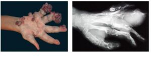 Enchondromas develop from the mesodermal dysplasia associated with Maffucci syndrome. As the bones grow, some cartilage material is left behind and grows irregularly, developing into the characteristic bone deformities. Bone irregularities in Maffucci syndrome include shortened length of the long bones, unequal leg length, pathologic fractures, and malunion of fractures.