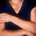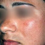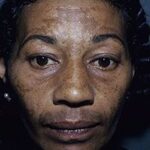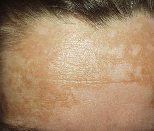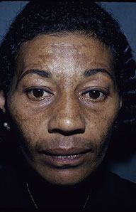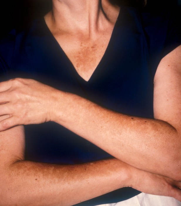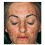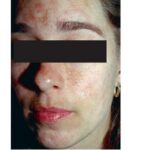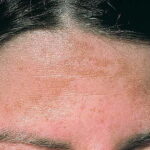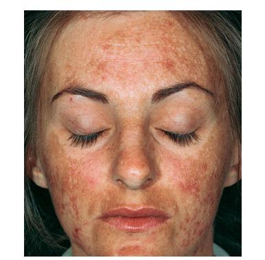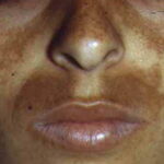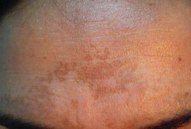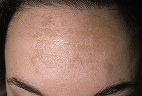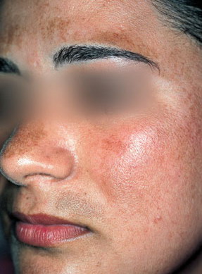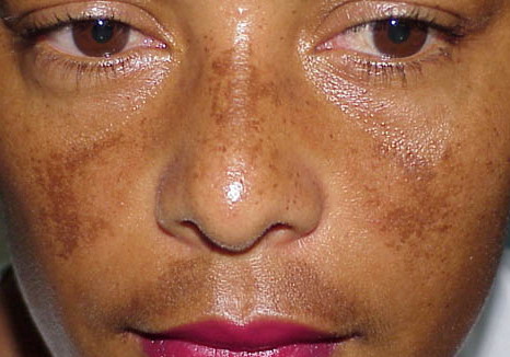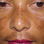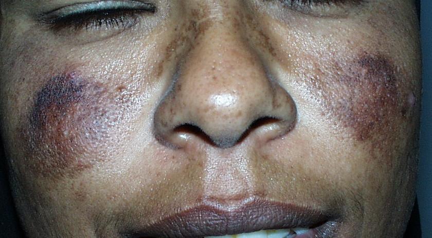 Melasma is rarely reported before puberty and is far more common in women, especially those of reproductive age. People with darker skin (type IV, V, or VI) are more frequently affected. The lesions are brownish macules with irregular borders and symmetric distribution in the face , often coalescing in a reticular pattern. Sun exposure intensifies the lesions. There are three major patterns of distribution of the lesions: centrofacial (63 percent: forehead, nose, chin, and upper lip), malar (21 percent: nose and cheeks), and mandibular (16 percent: ramus mandibulae). The anterior chest and dorsal forearms may also be affected.