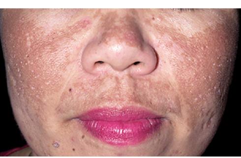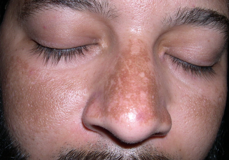 Melasma is a common hypermelanosis that typically occurs on sun-exposed areas in the face. The pathogenesis is poorly understood, but genetic and hormonal influences in combination with UV radiation are important. Specific precipitants include: birth control pills, estrogen replacement therapy, mild ovarian or thyroid dysfunction, ovarian tumors, cosmetics, nutrition, phototoxic and photoallergic medications, phototoxic drugs, and medication for epilepsy.