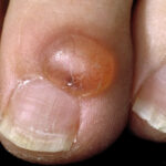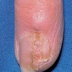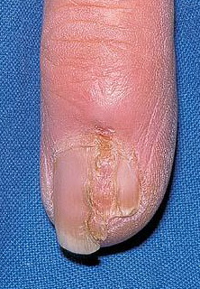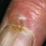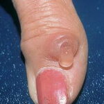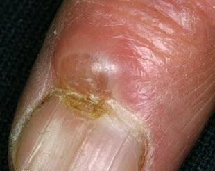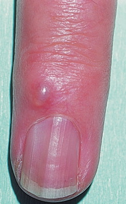 Myxoid cyst appears as a nodule of the proximal nail fold associated with a longitudinal groove in the correspondent nail plate. Because the cyst often drains spontaneously, the shape of the groove is irregular . Myxoid cysts usually affect the fingernails of middle-aged women and are associated with osteoarthritis of the interphalangeal joints.