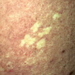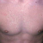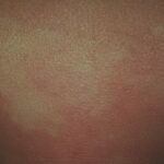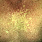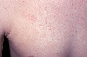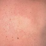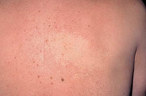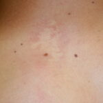 Clinically, nevus anemicus is a circumscribed, rounded, oval or linear pale macule or patch with irregular margins that may be surrounded by satellite macules. Lesions may be single or multiple and may be located on any part of the body, but most lesions commonly are found on the upper chest. Nevi anemicus occur more frequently in females and are usually asymptomatic. Nevus anemicus is noted at birth or in early childhood, although it may be easily overlooked.