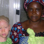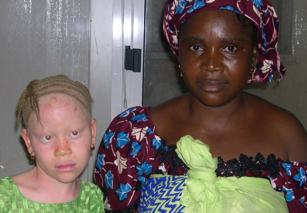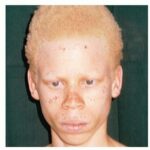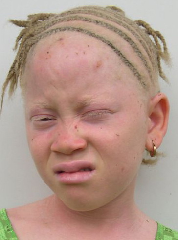 In African and African American individuals, there is a distinct OCA2 phenotype . Hair is yellow at birth and remains so throughout life, although the color may turn darker. Hair color can turn lighter in older individuals, and this probably represents normal graying with age. The skin is creamy white at birth and changes little with time. No generalized skin pigment is present, and no tan develops with sun exposure, but pigmented nevi, lentigines, and freckles often develop. The irides are blue-gray or light tan or brown. The development of lentigines or ephelides, well-demarcated pigmented patches usually on sun-exposed areas of the skin, may be evidence of a separate genetic susceptibility, because these lesions develop only in some OCA2 families and not in others. The presence of ephelides is associated with a lower risk of skin cancer in South African individuals.