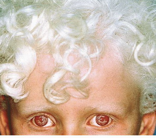 In OCA1A, or the classic tyrosinasenegative OCA, there is a complete inability to synthesize melanin in skin, hair, and eyes, which results in the characteristic “albino” phenotype. Affected individuals are born with white hair and skin, and there are no changes as they mature. The phenotype is the same in all ethnic groups and at all ages. The hair may develop a slight yellow tint due to denaturing of the hair protein related to sun exposure and/or shampoo use. The irides are translucent, appear pink early in life, and often turn a gray-blue color with time. No pigmented lesions develop in the skin, although amelanotic nevi can be present. The architecture of skin and hair bulb melanocytes is normal. The melanosomes show a normal melanosomal membrane, and normal internal matrix formation is observed in stage 1 and 2 melanosomes.
