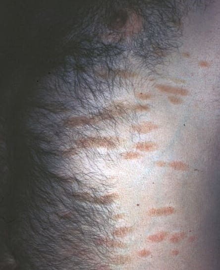 SPP characteristically occurs as round or oval discrete patches or very thin plaques, mainly on the trunk . The lesions measure less than 5 cm in diameter; they are asymptomatic and covered with fine, moderately adherent scales. The general health of the patient is unaffected. A distinctive variant with lesions of a finger shape, known as digitate dermatosis, has yellowish or fawn-colored lesions . It follows lines of cleavage of the skin and gives the appearance of a hug that left fingerprints on the trunk. The long axis of these lesions often measures greater than 5 cm. Chronic superficial dermatitis is a synonym for SPP.43 Digitate lesions with a yellow hue were referred to in the past as xanthoerythrodermia perstans.