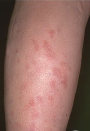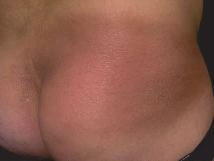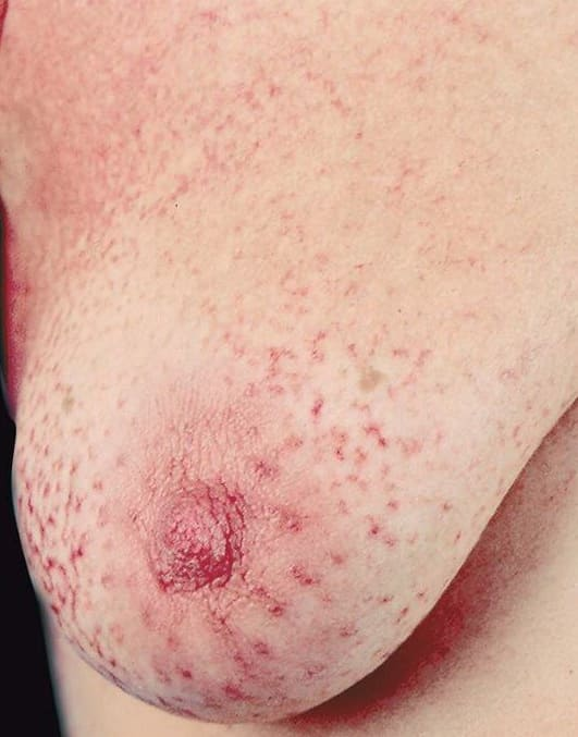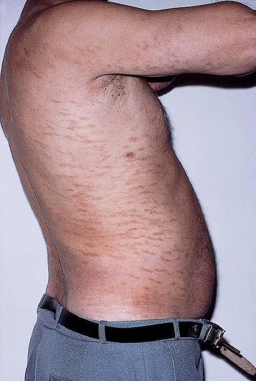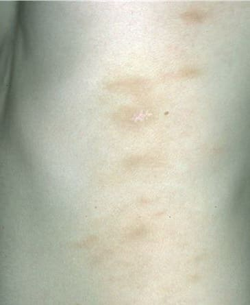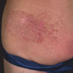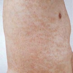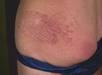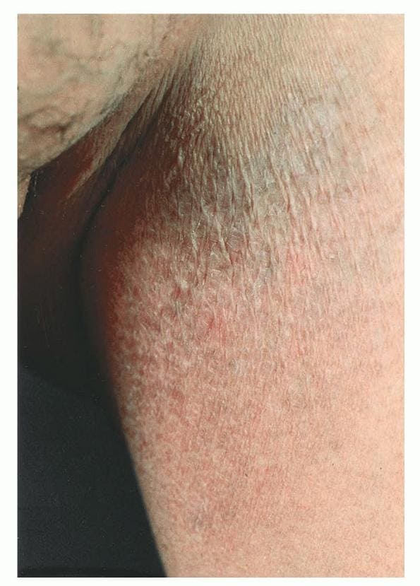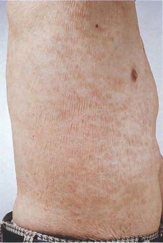 LPP lesions are either oval or irregularly shaped patches or very thin plaques that are asymptomatic or mildly pruritic. They are usually well marginated but may also blend imperceptibly into the surrounding skin. The size is variable, but typically most lesions are larger than 5 cm, often measuring more than 10 cm in diameter. Lesions are stable in size and may increase in number gradually. They are found mainly on the “bathing trunk” and flexural areas . Extremities and the upper trunk, especially the breasts in women, also may be involved. They are light red-brown or salmon pink, and their surface is covered with small and scanty scales. Lesions may appear finely wrinkled—“cigarette paper” wrinkling. Such lesions exhibit varying degrees of epidermal atrophy. Telangiectasia and mottled pigmentation also are observed when the atrophy becomes prominent (Fig. 25-3). This triad of atrophy, mottled pigmentation, and telangiectasia defines the term poikiloderma or poikiloderma atrophicans vasculare, which also may be seen in other conditions .