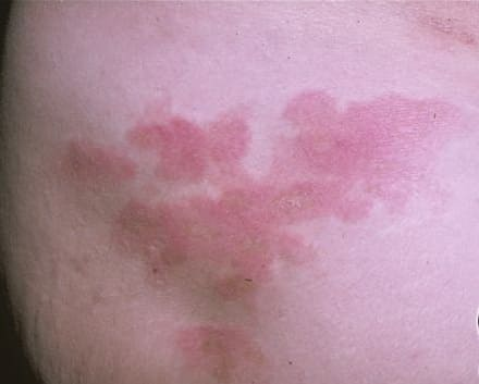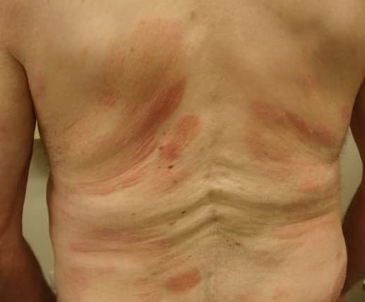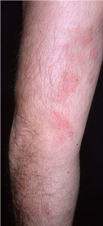 SPP characteristically occurs as round or oval discrete patches or very thin plaques, mainly on the trunk . The lesions measure less than 5 cm in diameter; they are asymptomatic and covered with fine, moderately adherent scales. The general health of the patient is unaffected. A distinctive variant with lesions of a finger shape, known as digitate dermatosis, has yellowish or fawn-colored lesions . It follows lines of cleavage of the skin and gives the appearance of a hug that left fingerprints on the trunk. The long axis of these lesions often measures greater than 5 cm. Chronic superficial dermatitis is a synonym for SPP.43 Digitate lesions with a yellow hue were referred to in the past as xanthoerythrodermia perstans.