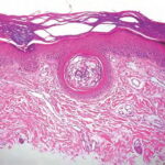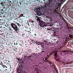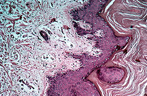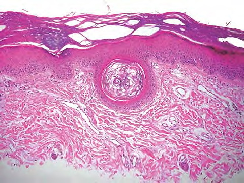Three basic skin eruptions occur in pellagrins . The first is a photo-induced eruption that is intensely erythematous and subsequently exfoliates to yield a hyperpigmented residuum. The second eruption comprises painful erythematous erosions in genital and perineal areas possibly induced by pressure, heat, and trauma . The increased skin fragility may reflect aberrations in the collagen and elastic fiber content of the skin. Pellagrins may develop a seborrheic dermatitis-like rash involving the face, scalp, and neck. Oral manifestations include beefy, red, cracked lips and a fissured or smooth, red, sore tongue . Among the neurologic symptoms are dementia, psychosis, anxiety, defective memory, burning sensations, sudden attacks of falling, dizziness, and headaches. A cause of sudden death is central pontine myelinolysis . Histopathology . Psoriasiform epidermal hyperplasia with hyperkeratosis, parakeratosis, and a lymphocytic perivascular inflammatory cell infiltrate characterize initial lesions. Additional features include scattered necrotic keratinocytes, granular cell layer loss, and architectural disarray with dysmaturation of the epidermis. Depigmentation of the basal layer with accumulation of fat droplets is described, as is vacuolation of cells within the granular and spinous layers . Epidermal atrophy, hypermelanosis, vascular ectasia, and sebaceous atrophy characterize end-stage lesions . Seborrheic dermatitis-like lesions may show sebaceous gland hyperplasia with follicular dilation. Fragmentation, swelling, and thickening of elastic fibers, swelling of collagen fibers, and merging of elastic tissue with collagen have been described. A morphology indistinguishable from that of necrolytic migratory erythema and acrodermatitis enteropathica has been reported, comprising intracellular edema with vacuolar change of the upper stratum malpighii and keratinocyte necrosis, sometimes accompanied by neutrophilic infiltration of the upper spinous layers, subcorneal pustulation localized to or in isolation from these areas, and folliculitis . |
