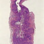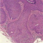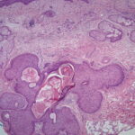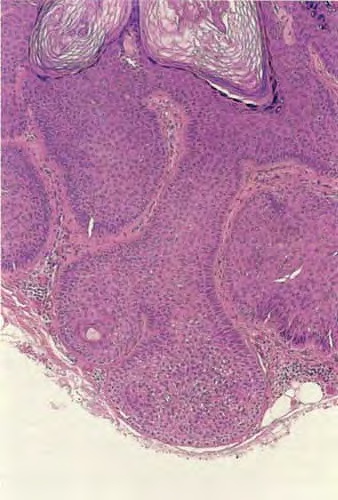 affected. Pilar sheath acanthoma is characterized by a small (5 to 10 mm in diameter), solitary, skin-colored papule situated on the head and neck, particularly around the upper lip. A central, occasionally keratin plugged pore is often present. Histologically, there is a crateriform depression in the epidermis representing a widely dilated, keratin-filled infundibulum or closely set infundibula contiguous at the base with numerous epithelial lobules of pink keratinocytes. The epithelial lobules radiate into the dermis, sometimes with involvement of the subcutis. They are surrounded by a narrow rim of fibrous tissue. The epithelium shows similar features to those of the isthmus of a normal hair follicle. Small infundibulocystic structures, tubular structures, and foci of sebaceous differentiation (ducts or sebaceous lobules) are variably observed in individual cases. Treatment is surgical excision