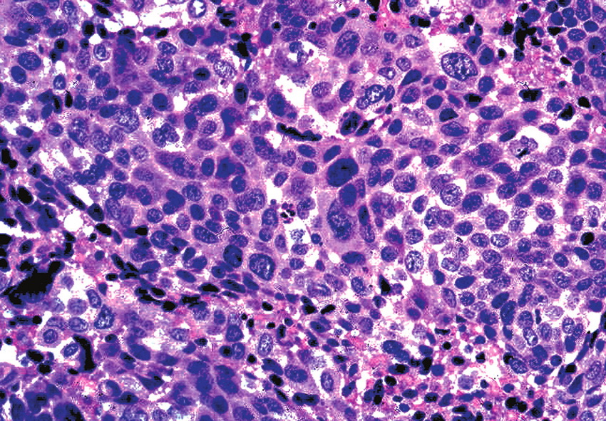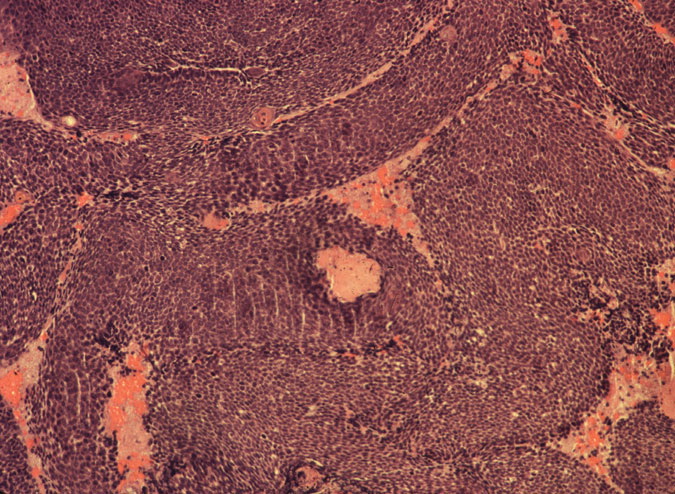 Pilomatrical carcinoma (matrical carcinoma) is a rare tumor found on the head and neck of older adults. Clinical appearances are generally not distinctive. Most cases probably develop de novo, but malignant transformation from a benign pilomatricoma has been reported. Histopathologic examination shows irregularly sized and variously shaped cutaneous/subcutaneous epithelial islands of basaloid (matrical and supramatrical) cells with conspicuous foci of shadow cells . The basaloid cells reveal nuclear atypia and mitoses, as well as areas of geographic necrosis.Pilomatrical carcinoma is primarily locally aggressive, but distant metastases, especially to lungs, bones, and lymphatics, have rarely been reported. Treatment of choice is surgical excision with adequate margins