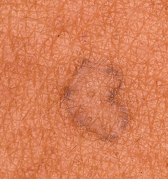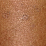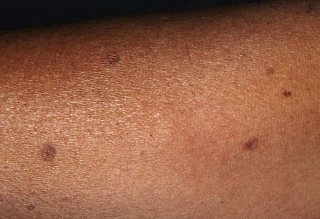 Disseminated superficial actinic porokeratosis (DSAP) is the most common of the porokeratoses. Lesions are characteristically uniformly small, annular, asymptomatic or mildly pruritic papules ranging from 2 to 5 mm in diameter, distributed symmetrically on the extremities. Lesions are more generalized than other forms of porokeratosis, with typically in excess of 50 lesions located predominantly in sun-exposed sites . A history of increased prominence with sun exposure is usually reported. Although widespread, lesions typically spare palms, soles, and mucous membranes. Compared with porokeratosis of Mibelli, the hyperkeratotic border is characteristically more subtle. As the lesions progress, the older, central area becomes atrophic and anhidrotic. DSAP tends to be inherited as an autosomal dominant disorder, with the earliest reported age of onset at 7 years, and is usually fully penetrant by the third or fourth decade of life. Initial reports of induction of lesions by exposure to ultraviolet light and hypersensitivity of DSAP-derived fibroblasts to x-rays have not been consistently reproduced, and the pathogenesis of DSAP remains unknown.