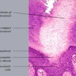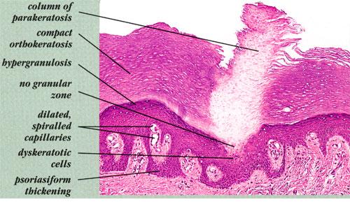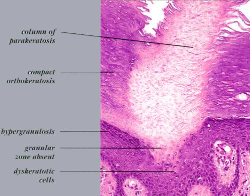 Histopathologic patterns are similar in all forms of porokeratosis, with the characteristic changes evident at the raised and advancing edge of the lesion. The stratum corneum is hyperkeratotic, with a thin column of poorly staining parakeratotic cells, the cornoid lamella, running through the surrounding normal-staining cells . The underlying keratinocytes are edematous with spongiosis and shrunken nuclei, and a striking dermal lymphocytic pattern may be evident. Underlying the cornoid lamella, the granular layer is either absent or markedly reduced but is of normal