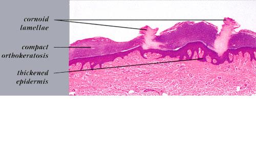 thickness in other areas of the lesion. The epidermis in the central portion of porokeratosis may be normal, hyperplastic, or atrophic. Although characteristic of porokeratosis, the cornoid lamella is not pathognomonic and may also be found in other conditions, such as viral warts, some ichthyoses, and nevoid hyperkeratoses.