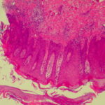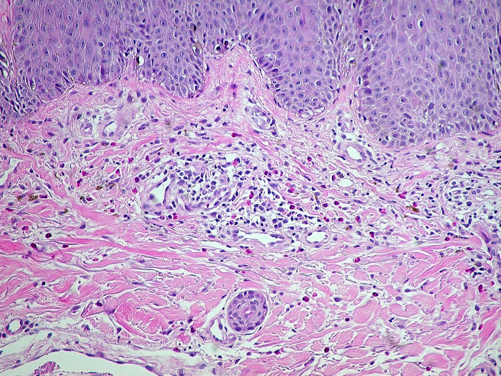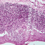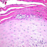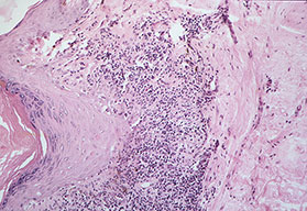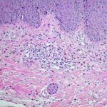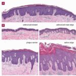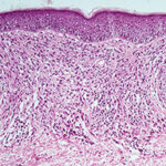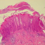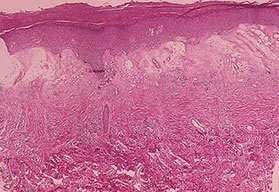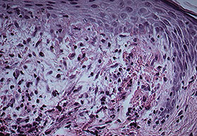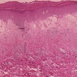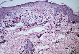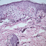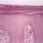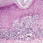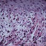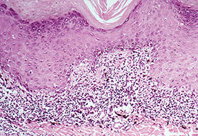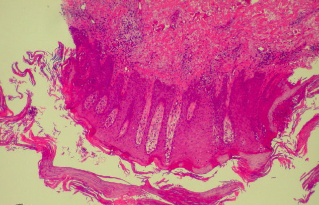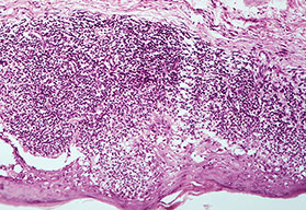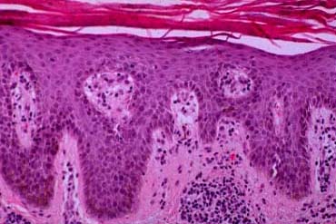 Very early lesions may show spongiosis and exocytosis of lymphocytes in the lower epidermis overlying the tips of dermal papillae (. This may be followed by the formation of a small intraepidermal vesicle containing mostly lymphocytes . Subsequently, there is a massive exocytosis of neutrophils, which penetrate the intercellular spaces of the vesicle wall, where the histologic picture of spongiform pustules is then seen . In the acute form, pustular bacterid, leukocytoclastic vasculitis has been described . |