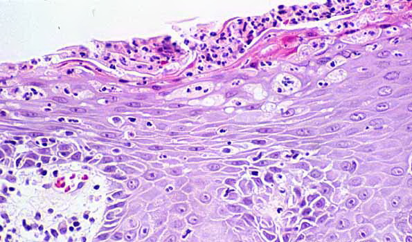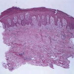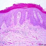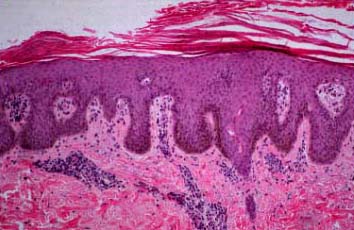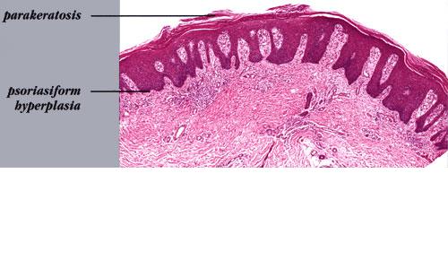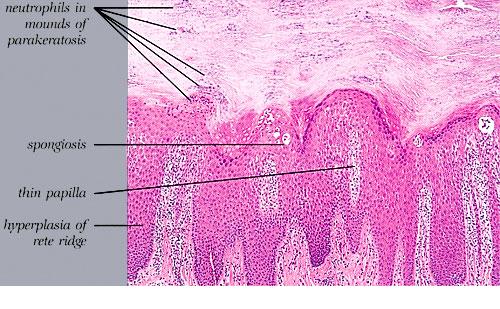 Histopathology The histologic picture in most cases is similar to that of psoriasis. In others, the histologic sections may show acanthosis without thinning of the suprapapillary epidermis, slight spongiosis, rare necrotic keratinocytes, and a superficial perivascular infiltrate of lymphocytes and histiocytes that occasionally contains some plasma cells . As in other dermatitides related to AIDS, eosinophils may be present in the inflammatory infiltrate. |
