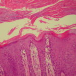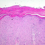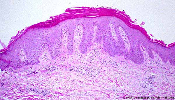 An entirely typical histologic picture as described earlier is not always found, even if the biopsy specimens are taken from clinically typical lesions of psoriasis . Orthokeratosis often appears intermingled with parakeratosis. In such cases, one may see vertically adjoining areas of orthokeratosis and parakeratosis, focal parakeratosis, or, occasionally, alternating layers of orthokeratosis and parakeratosis. The last-named pattern |