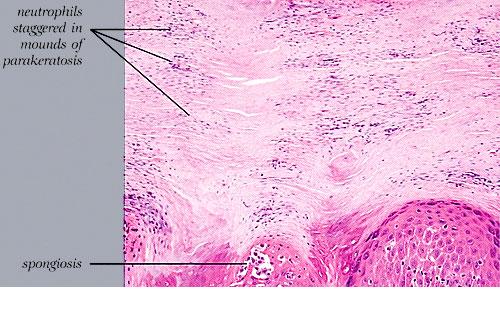 The earliest pinhead-sized macules or smooth-surfaced papules show subtle histologic changes with a preponderance of dermal changes . At first, there is capillary dilation and edema in the papillary dermis, with a lymphocytic infiltrate surrounding the capillaries. The lymphocytes extend to the lower portion of the epidermis, where slight spongiosis develops. Then focal changes occur in the upper portion of the epidermis, where granular cells become vacuolated and disappear, and mounds of parakeratosis are formed. Neutrophils are usually seen only at the summits of some of the mounds of parakeratosis and appear scattered through an otherwise orthokeratotic cornified layer . These mounds of parakeratosis with neutrophils represent the earliest manifestation of Munro microabscesses . At this stage, which is characterized clinically by an early scaling papule, a histologic diagnosis of psoriasis can often be made. In some cases, when there is marked |