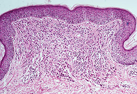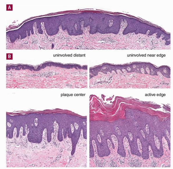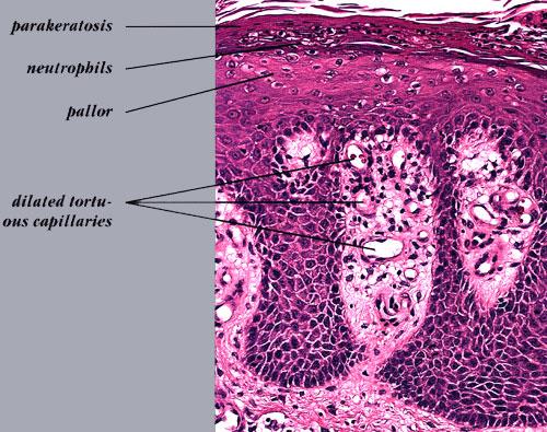 The histologic picture of erythrodermic psoriasis in some instances shows enough of the characteristics of psoriasis to allow this diagnosis. Frequently, however, the histologic appearance is indistinguishable from that of a chronic eczematous dermatitis . |