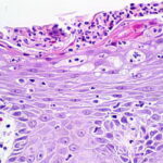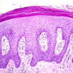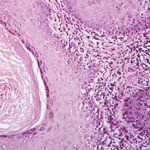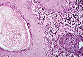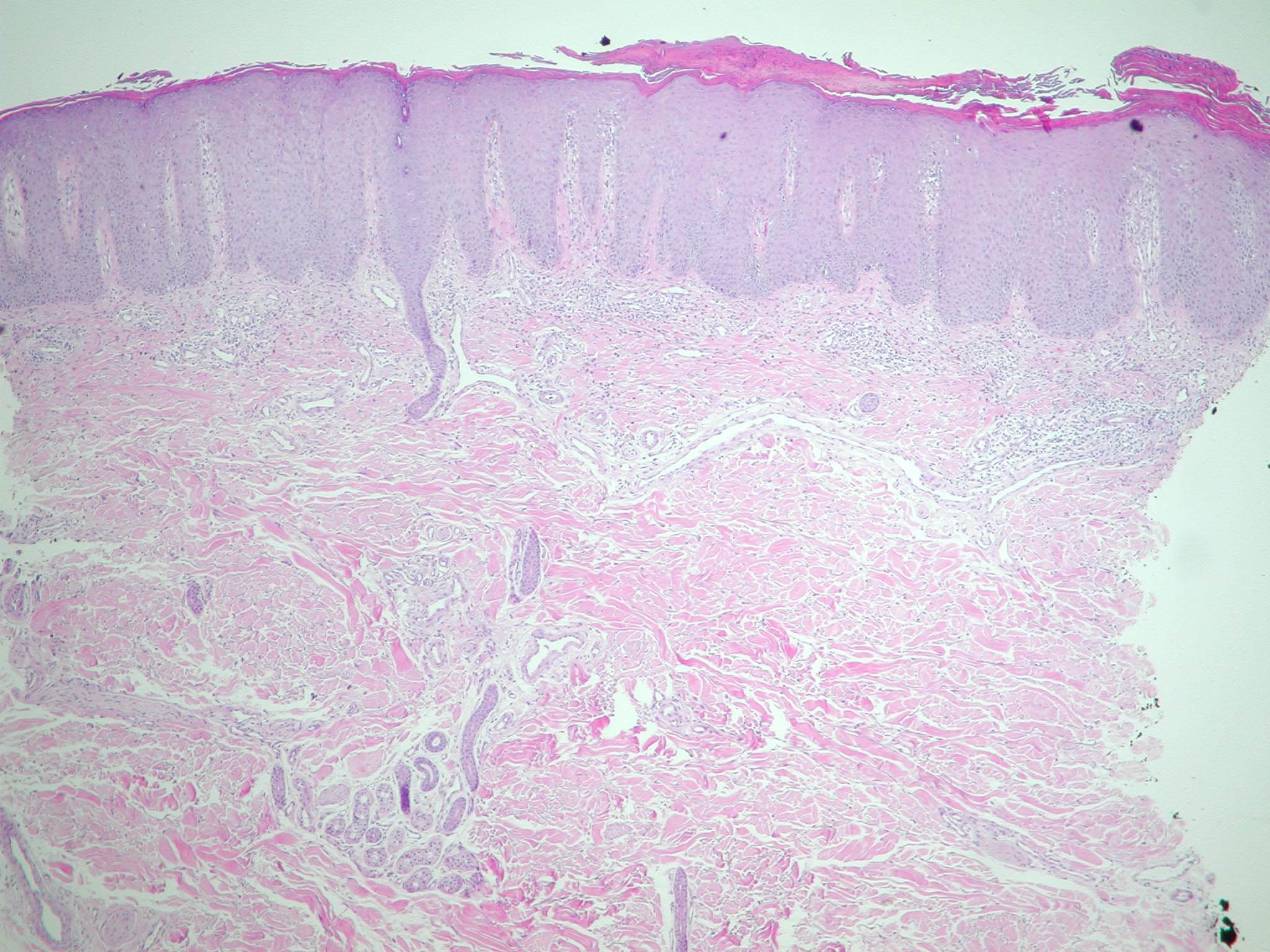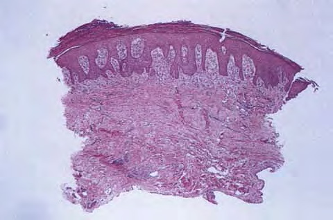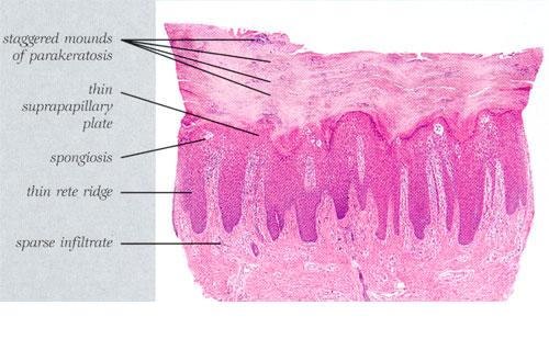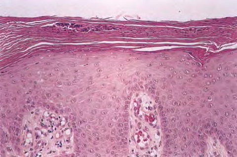 In some instances the cornified layer consists entirely of confluent parakeratosis forming a platelike scale with a concomitant absence or diminution of the granular layer. However, occasional focal orthokeratosis with preservation of the underlying granular cells is present. |