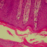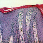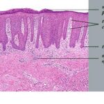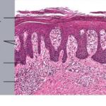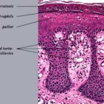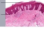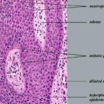 The ultrastructure of the capillary loops in the dermal papillae shows them to be different from normal capillary loops. In psoriasis, the capillaries show a wider lumen, bridged fenestrations and gaps between endothelial cells, edematous areas in the cytoplasm of endothelial cells, pericytes and myocytes, extravasation of red blood cells and inflammatory cells, and a thickened multilayered basement membrane . This finding may be a result of the deposition of amorphous substances and accumulation of collagen fibrils in the basement membrane zone . |