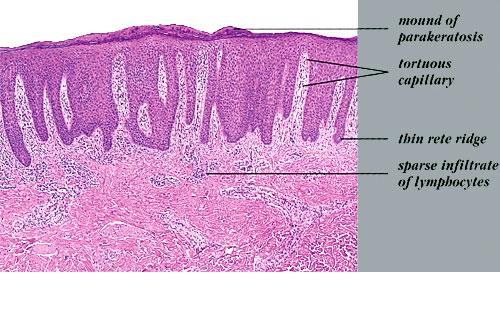Munro microabscesses are located within the parakeratotic areas of the cornified layer . They consist of accumulations of neutrophils and pyknotic nuclei of neutrophils that have migrated there from capillaries in the papillae through the suprapapillary epidermis. As a rule, Munro microabscesses are easily found in early lesions but are few in number or absent in longstanding lesions . The dermal papillae, in accordance with the elongation and basal thickening of the rete ridges, are elongated and club shaped. They show edema, and the capillaries within them appear dilated and tortuous. A relatively mild inflammatory infiltrate is present in the upper dermis and the papillae. It consists of lymphocytes, except in early lesions, in which neutrophils are also present in the upper portion of the papillae . |