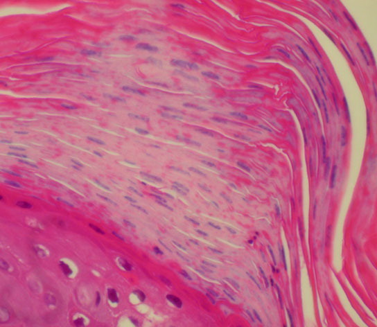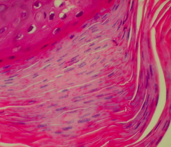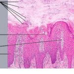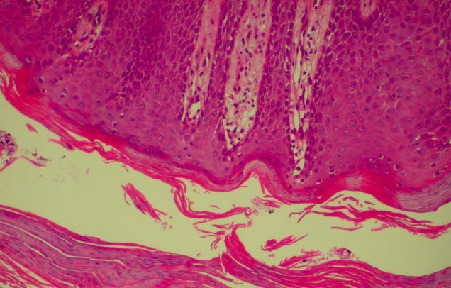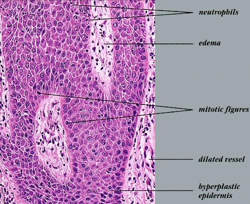 show thickening ("clubbing") in their lower portion. Not infrequently, adjacent rete ridges seem to coalesce at their bases due to tangential sectioning. Usually, intercellular and intracellular edema is absent in the rete ridges, and keratinocytes located well above the basal layer show deep basophilia. In addition, mitoses are not limited to the basal layer as in normal skin but are also seen above the basal layer. This, together with a considerable lengthening of the basal cell layer due to elongation of the rete ridges, results in a marked increase in the number of mitoses. This increase has been calculated to be 27 times the number of mitoses in uninvolved skin . |
