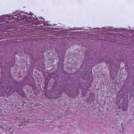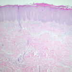 Guttate or eruptive psoriasis shows the histologic features of an early or active lesion of psoriasis, where there is more pronounced inflammatory infiltrate and less acanthosis as compared with a well-developed chronic plaque of psoriasis. Because of its acute onset, one may observe the remaining normal basket-weave orthokeratotic cornified layer overlying the mounds of parakeratosis with neutrophils, which, in turn, may appear loosely arranged . |