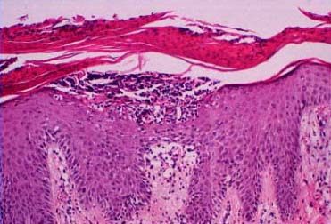 The suprapapillary epidermis appears relatively thin in comparison with the markedly elongated rete ridges, and the cells in the upper layers of the epidermis may appear enlarged and pale stained as a result of intracellular edema and hypogranulosis. Keratinocytes beneath the parakeratotic cornified layer may be intermingled with neutrophils . The histologic picture is then that of a small spongiform pustule of Kogoj . Although it is only a micropustule, it is nevertheless of the same type as the much larger macropustules seen in pustular psoriasis. Such a spongiform pustule, highly diagnostic for psoriasis and its variants, shows aggregates of neutrophils within the interstices of a spongelike network formed by degenerated and thinned epidermal cells |
