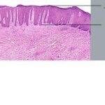 In addition to the large spongiform pustules, the epidermal changes in generalized pustular psoriasis are very much like those seen in psoriasis vulgaris, consisting of parakeratosis and elongation of the rete ridges. The upper dermis contains an infiltrate of lymphocytes, and neutrophils can often be seen migrating from the capillaries in the papillae into the epidermis . The oral lesions show the same spongiform pustule formation as those seen on the skin . In the healing stage, the lesions of all types of generalized pustular psoriasis may present the same histologic appearance as ordinary psoriasis . |
