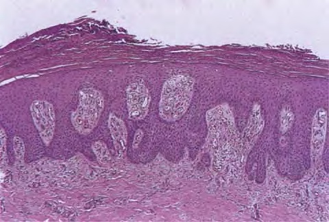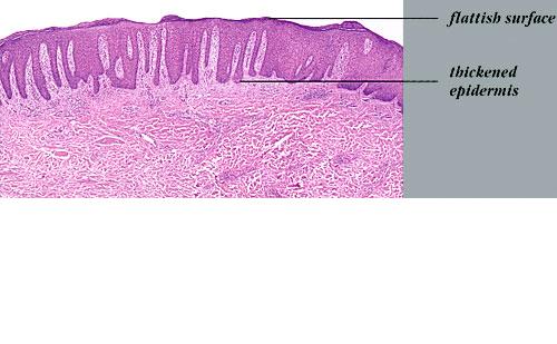 The rete ridges show considerable elongation and extend downward to a uniform level, resulting in regular acanthosis . They are often slender in their upper portion but |