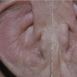 Dermatologic manifestations are sometimes the presenting feature of RP (12 percent), and ultimately become apparent in more than one-third of patients.6 They are non-specific including nodules on the limbs , purpura , oral or complex aphthosis , papules, sterile pustules , superficial phlebitis, livedo reticularis, ulcerations on the limbs, and distal necrosis . They appear concomitantly or in the absence of attacks of chondritis. Pathologic features include inflammatory or thrombotic vascular lesions, neutrophil infiltrates as in neutrophilic dermatoses, and inflammation of the dermis or subcutis. Patients with and without dermatologic manifestations have similar clinical manifestations of RP. However, the frequency of dermatologic manifestations (> 90 percent), age of onset of chondritis, and male-female ratio seems higher when RP is associated with myelodysplasia.