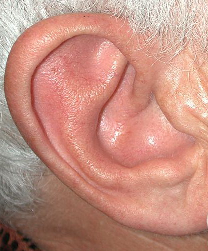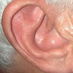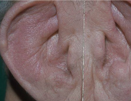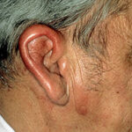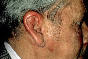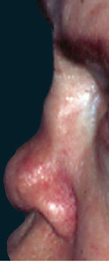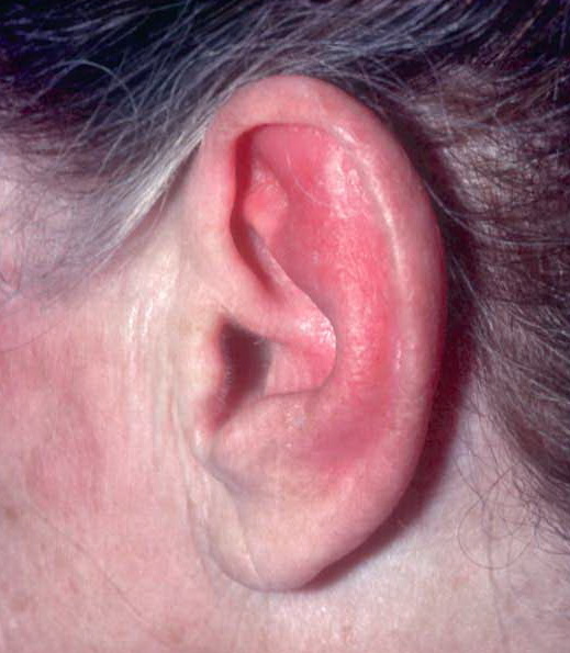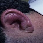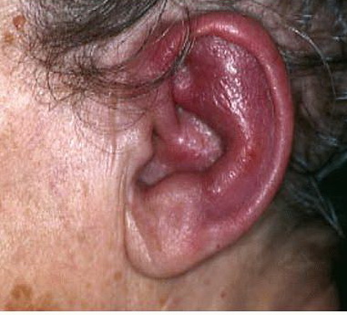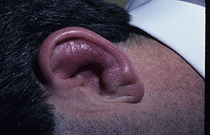 Attacks of chondritis usually occur in a relapsing and remitting pattern. Inflammatory episodes generally last a few days or weeks and may subside spontaneously or with treatment; recurrences after weeks or months occur and subsequently result in cartilage destruction. Auricular chondritis is the most frequent sign, occurring in 85 percent of patients, causing pain, redness, and swelling of the cartilaginous portion of the pinna, sparing the non-cartilaginous lobe . Biopsy of the auricular cartilage is not needed to make a correct diagnosis. After several attacks, the pinna may become soft and floppy, looking like a cauliflower ; sometimes it is stiff due to calcifications. Nasal chondritis (65 percent) is less inflammatory, presenting with nasal pain, stuffiness, rhinorrhea, and, sometimes, epistaxis. The characteristic saddle-nose deformity may appear with or without previous clinical inflammatory episodes.