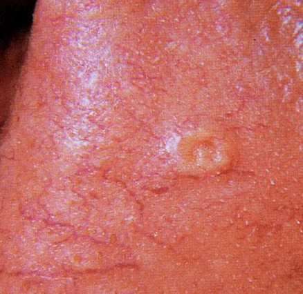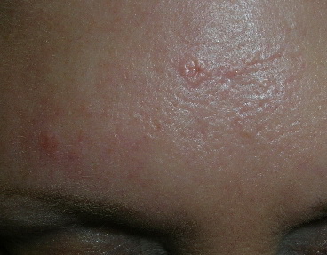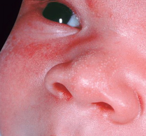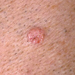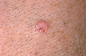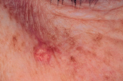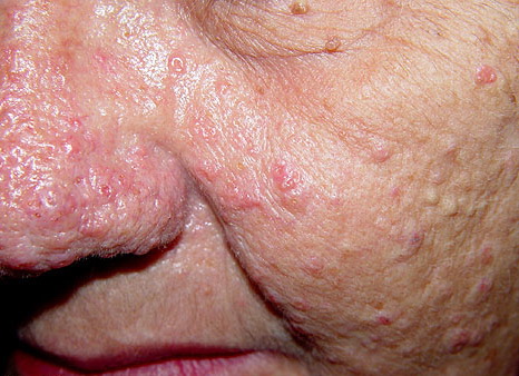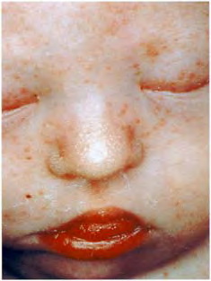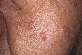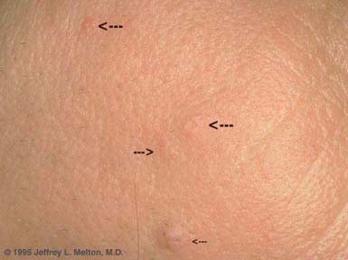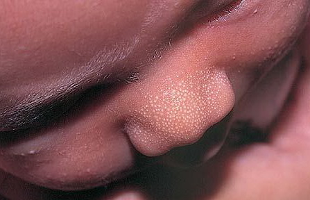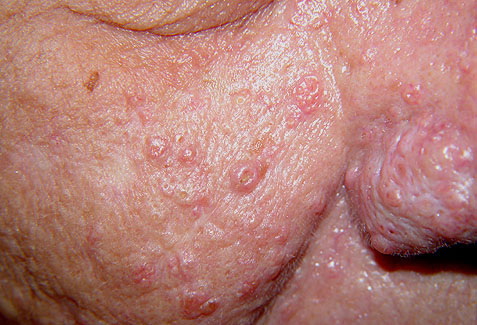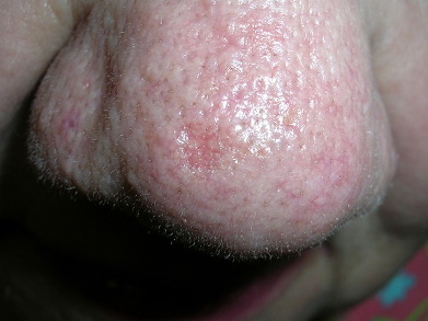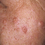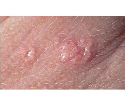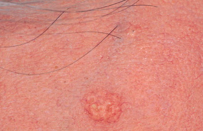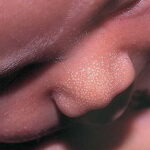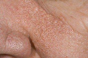 Males are more commonly affected than females by sebaceous hyperplasia, a common tumor. Rare cases show a familial pattern. Sebaceous hyperplasia presents commonly as solitary or multiple, small (less than 3 mm in diameter), yellowish papules on the face, particularly on the forehead of middle-aged individuals. Lesions often reveal a central dell . Clinically, lesions are often suspected to be basal cell carcinomas. Unusual presentations of sebaceous hyperplasia include linear and zosteriform lesions, giant and diffuse tumors, and lesions confined to the areola or genital (vulva) region. Rhinophyma  is currently widely considered to represent a special form of sebaceous hyperplasia.