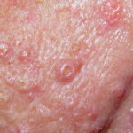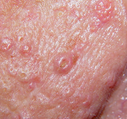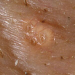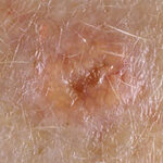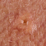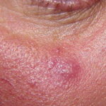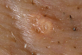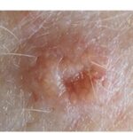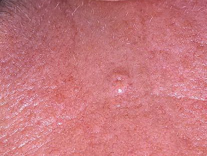 Histologically, sebaceous hyperplasia reveals large mature sebaceous lobules clustered around discrete, often dilated, infundibula located mainly in the upper dermis. The infundibulum is sometimes filled with debris and bacteria, and may contain a vellus hair.A variety of treatment options exist including electrodesiccation, CO2 laser surgery, cryosurgery, and shave excision with curettage