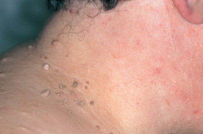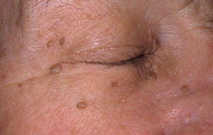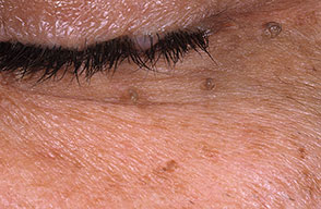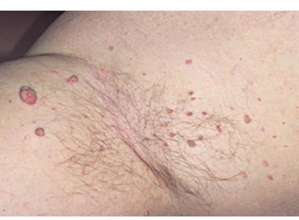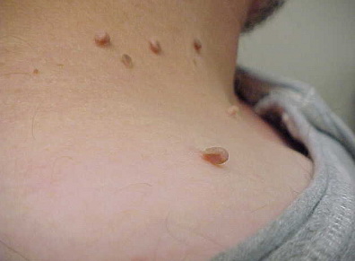 These rough, 1- to 2-mm, pedunculated papules are commonly located in areas of friction. The axilla, inframammary area, and neck are common locations where these papules commonly appear. Spontaneous regression can occur
