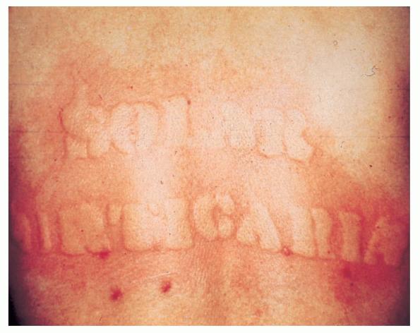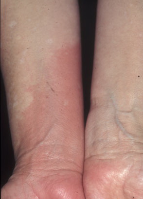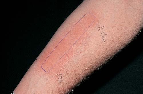 SU is a rare UVR- or visible radiation-induced wealing of exposed skin. The more common primary SU occurs spontaneously, and the very rare secondary form follows photosensitization to drugs or chemicals . Primary SU is slightly more common in women, with onset at any age but mostly between 10 and 50 years. The eruption develops on exposed skin within 5 to 10 minutes and fades within an hour or two. Regularly uncovered sites such as the face and backs of hands are occasionally spared. A tingling sensation and patchy erythema generally precede separate or confluent wealing, the latter sometimes generalized and in severe instances occasionally associated with headache, nausea, bronchospasm, faintness, or systemic collapse. Secondary SU generally follows exposure to substances such as tar, pitch, dyes, drugs such as the discontinued benoxaprofen, or very rarely endogenous porphyrin in the porphyrias. Avoidance of the inducing radiation, the use of appropriate sunscreens, or in particular adequate doses of nonsedating antihistamines helps approximately half of patients. Resistant cases sometimes respond to low-dose narrowband UVB phototherapy, low-dose PUVA or particularly plasmapheresis, or failing that, very rarely to intravenous immunoglobulin or cyclosporine. However, a proportion of SU patients do poorly with all therapy. |