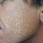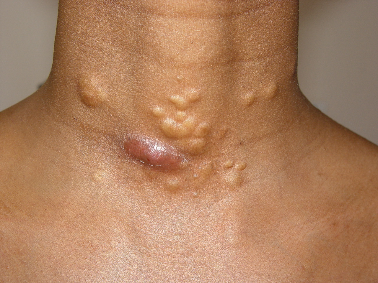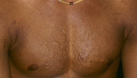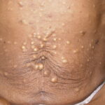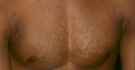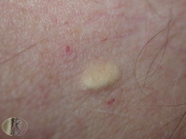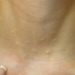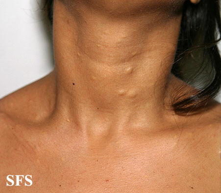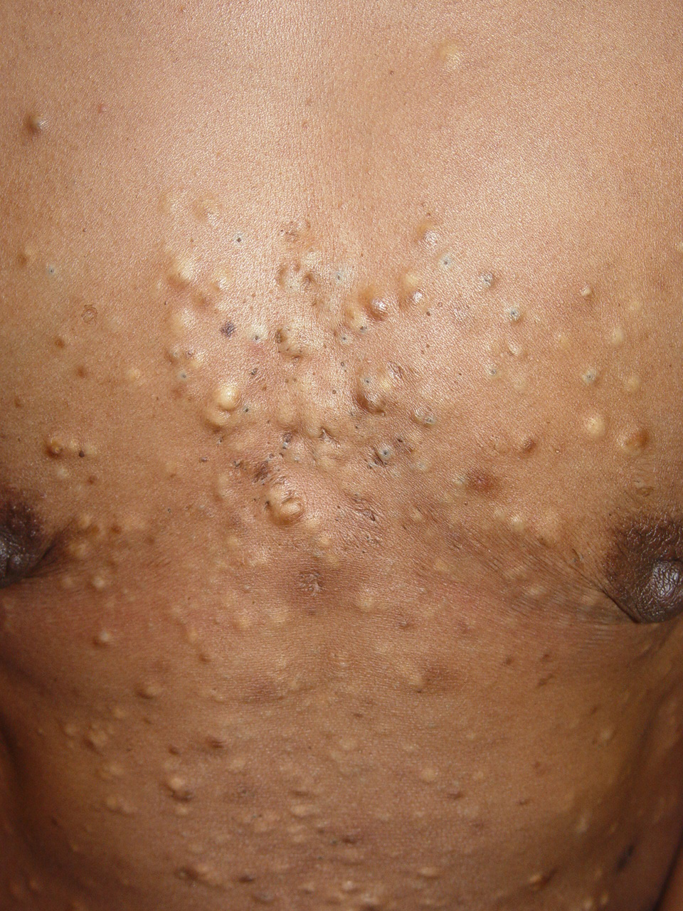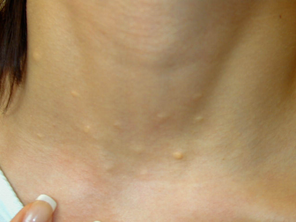 These lesions present as asymptomatic, yellow or skin-colored dermal papules or cysts located most commonly on the trunk, upper arms, scrotum, or chest . Oily material can be expressed from these lesions when incised. These lesions can become infected and suppurate, resulting in sinus formation and scarring.