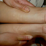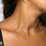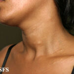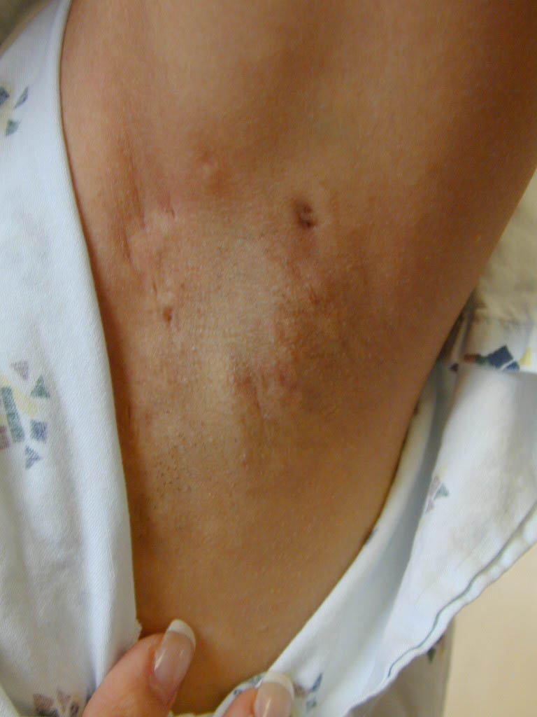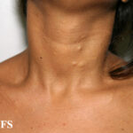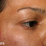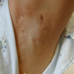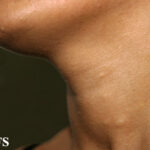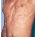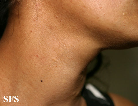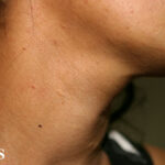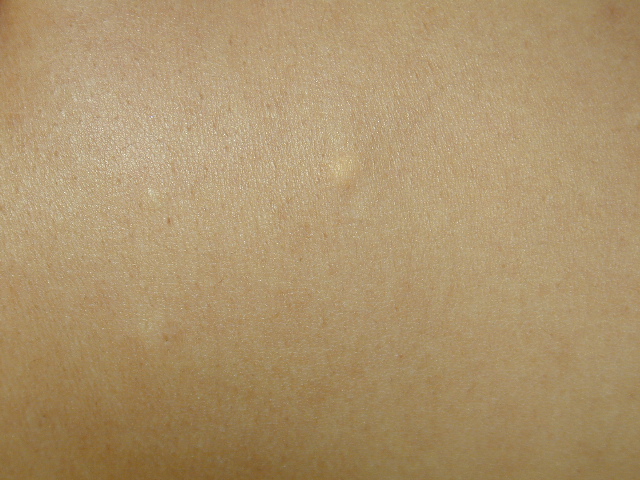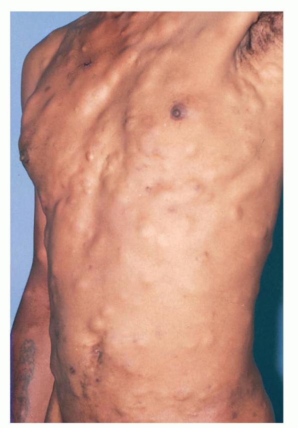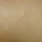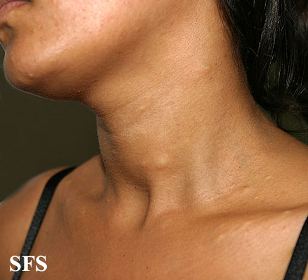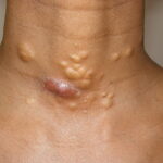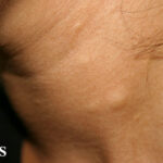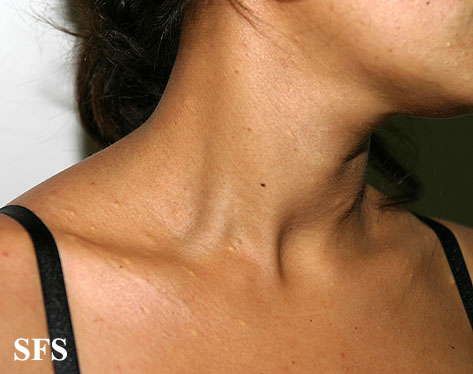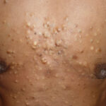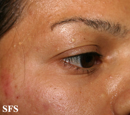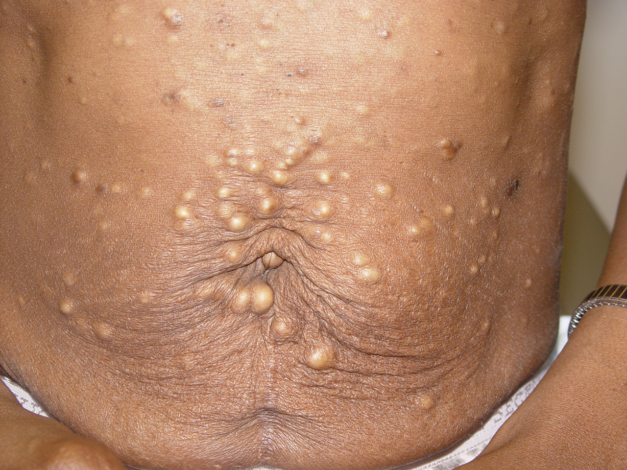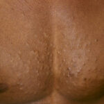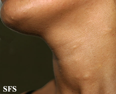 These lesions present as asymptomatic, yellow or skin-colored dermal papules or cysts located most commonly on the trunk, upper arms, scrotum, or chest . Oily material can be expressed from these lesions when incised. These lesions can become infected and suppurate, resulting in sinus formation and scarring.