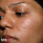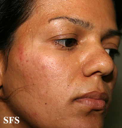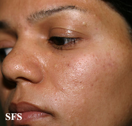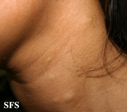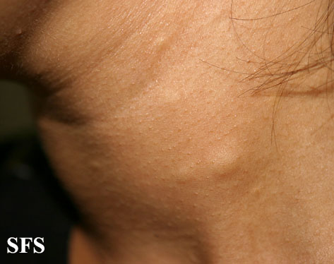 Steatocystoma multiplex, (sebocystomatosis, epidermal polycystic disease) can be a sporadic or autosomal-dominant disorder. These lesions can also be found in syndromes