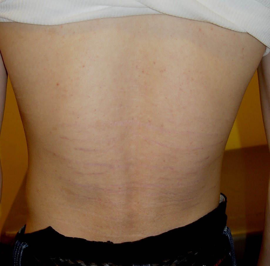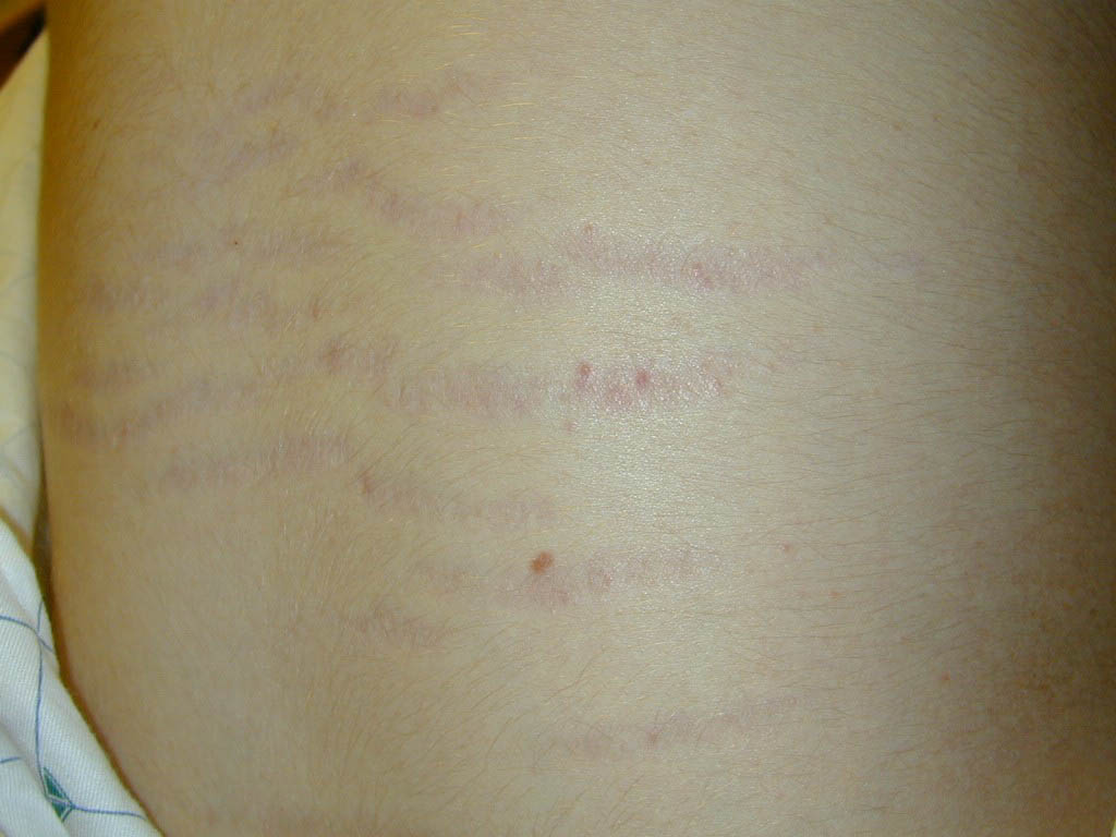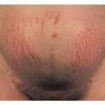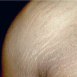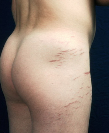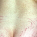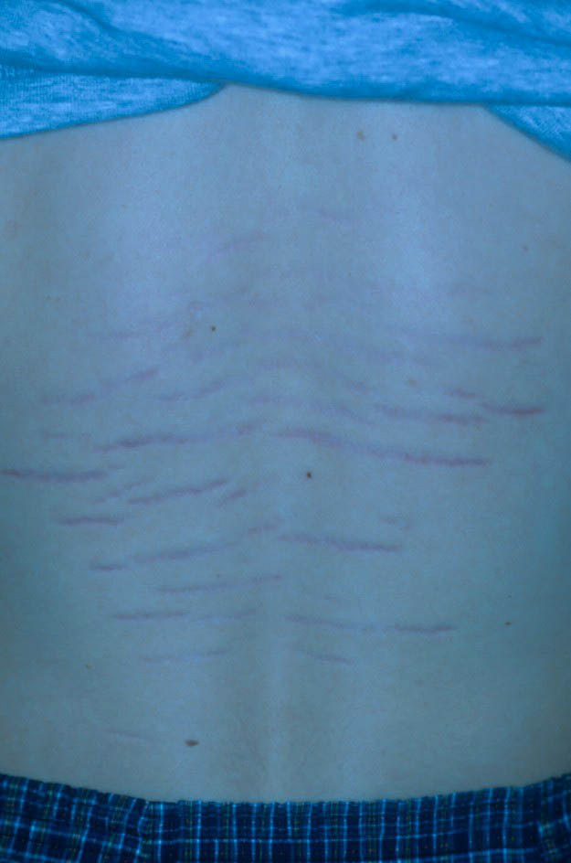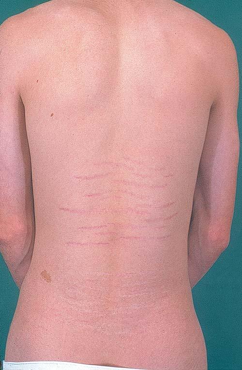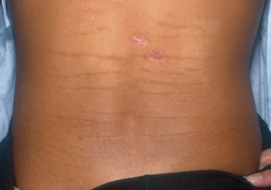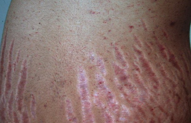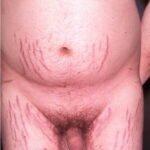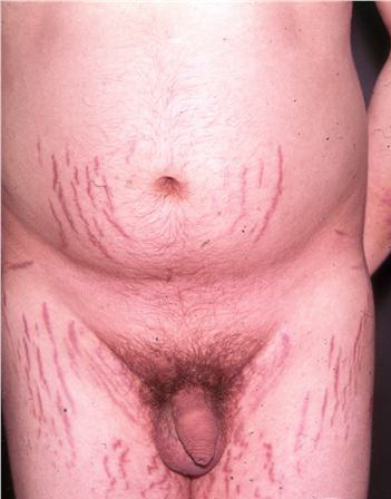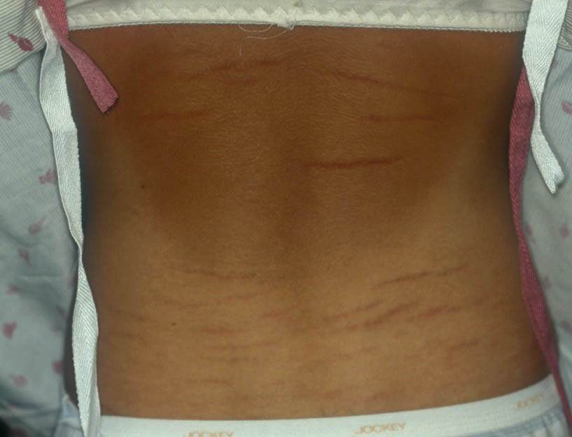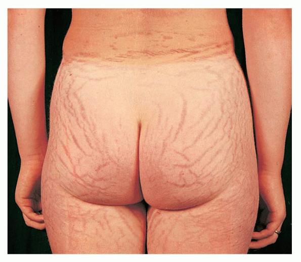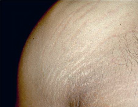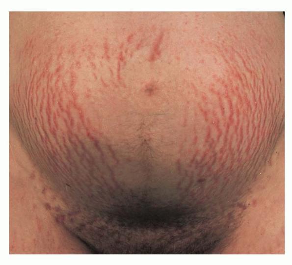 Striae are usually multiple, symmetric, well-defined linear atrophic lesions that follow the lines of cleavage. Initially, striae appear as red-to-violaceous elevated lines (striae rubra) . Over time, the color gradually fades, and the lesions become atrophic, with the skin surface exhibiting a fine, white, wrinkled appearance (striae alba). The striae can measure several centimeters in length and a few millimeters to a few centimeters in width. The striae associated with systemic corticosteroid therapy and Cushing syndrome can be larger and more widely distributed.