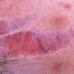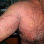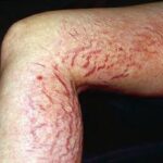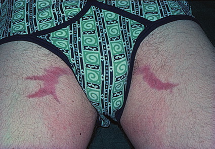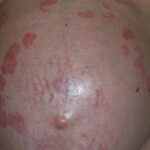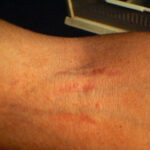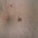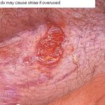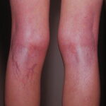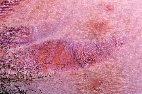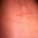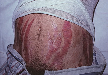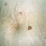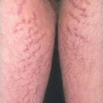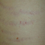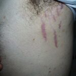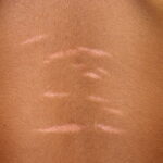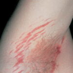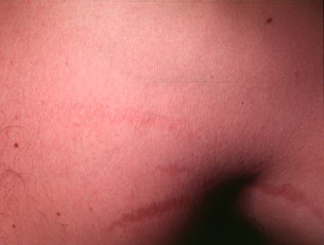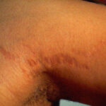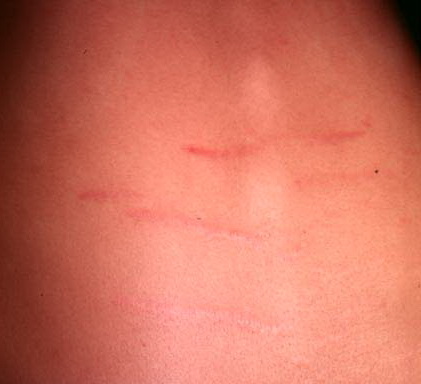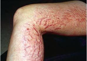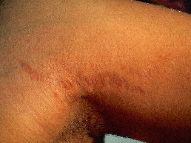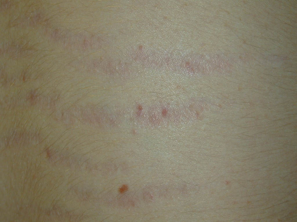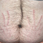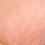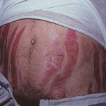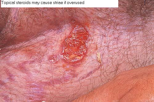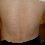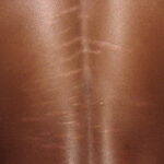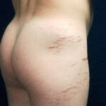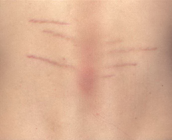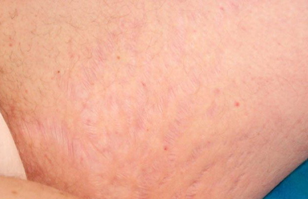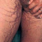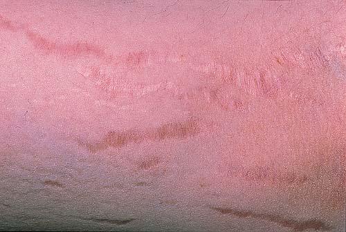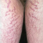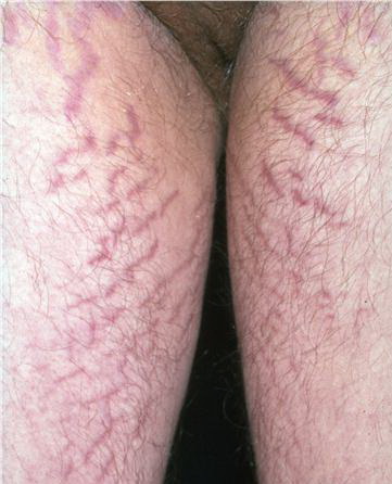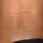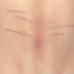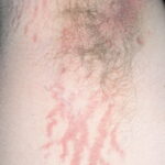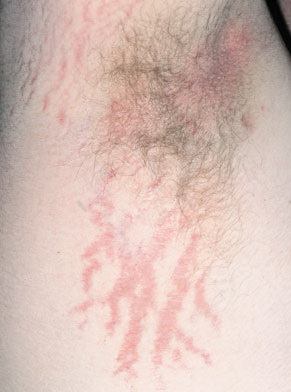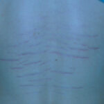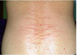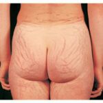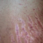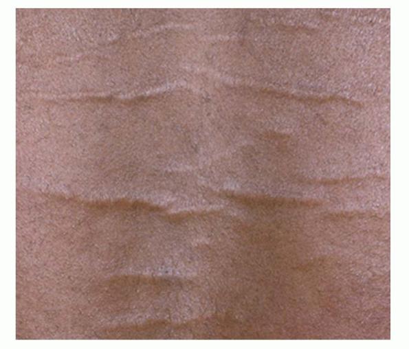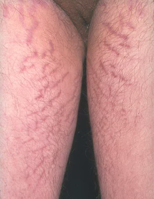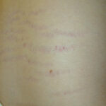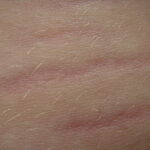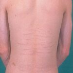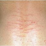 Striae are usually multiple, symmetric, well-defined linear atrophic lesions that follow the lines of cleavage. Initially, striae appear as red-to-violaceous elevated lines (striae rubra) . Over time, the color gradually fades, and the lesions become atrophic, with the skin surface exhibiting a fine, white, wrinkled appearance (striae alba). The striae can measure several centimeters in length and a few millimeters to a few centimeters in width. The striae associated with systemic corticosteroid therapy and Cushing syndrome can be larger and more widely distributed.