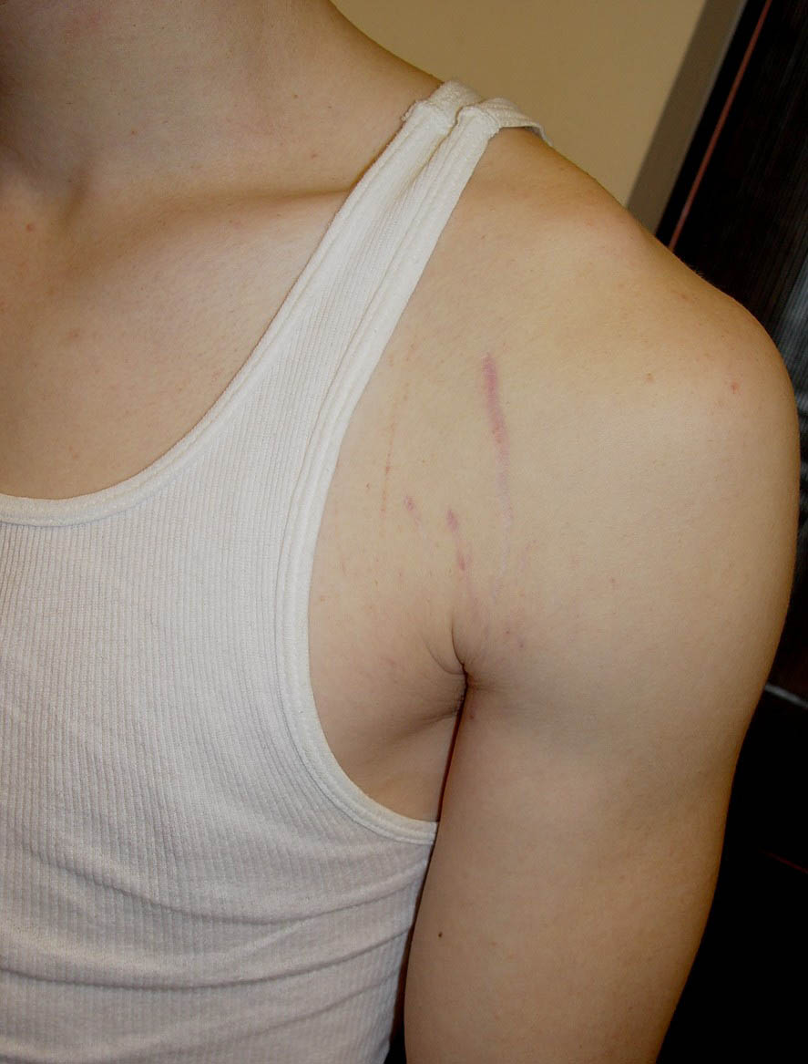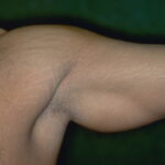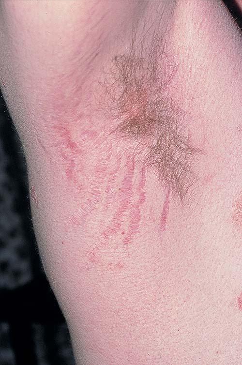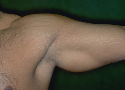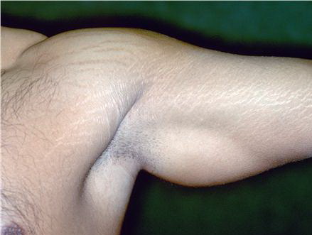 During puberty, striae appear in areas where there is a rapid increase in size. In girls, the most common sites are the breasts, thighs, hips, and buttocks, whereas in boys, they are seen on the shoulders, lumbosacral region, and thighs. Other less common sites include the abdomen, upper arms, neck, and axillae.