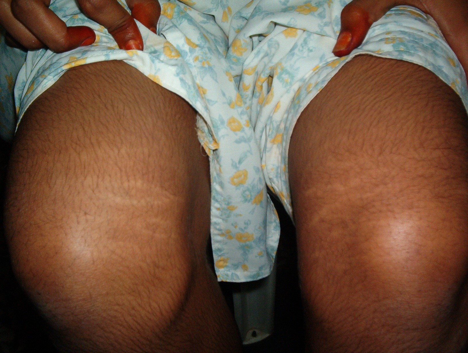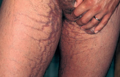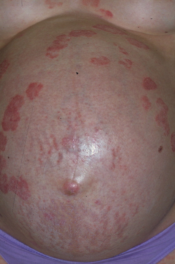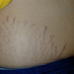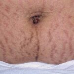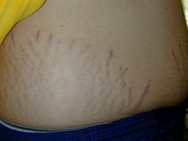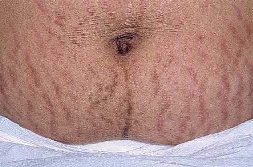Striae distensae are a common finding on the abdomen, and less so the breasts and thighs, of pregnant women, especially during the last trimester. They are more common in younger primigravidas than in older pregnant women. Striae gravidarum can be associated with a higher risk of lacerations during vaginal delivery.23