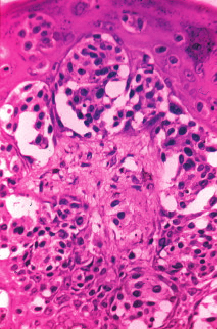 A final pitfall in evaluating nonmelanocytic mimics of intraepidermal melanoma involves the variable tendency of keratinocytes within the uppermost epidermal layers to exhibit perinuclear retraction presumably due to cytoplasmic glycogenation combined with tissue processing. Some body sites (e.g., areola and along the milk line) may be particularly prone to this change, perhaps in part the result of so-called "clear cells of Toker." These cells may produce the false appearance of true pagetoid spread in an otherwise benign or dysplastic melanocytic lesion, thus inciting consideration of a diagnosis of superficial spreading melanoma. However, keratinocytes so altered are recognizable at high magnification as cells with nuclei surrounded by clear spaces (retraction clefts) that themselves are bordered by a rim of cytoplasm and joined by desmosomes, in contrast to pagetoid melanoma cells, which lack desmosomes and whose nuclei are directly enveloped by relatively clear cytoplasm that may be surrounded by a thin, clear mantle of retraction that separates the cell from adjacent keratinocytes. |
