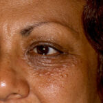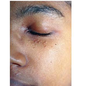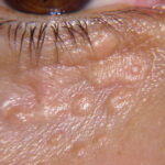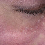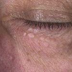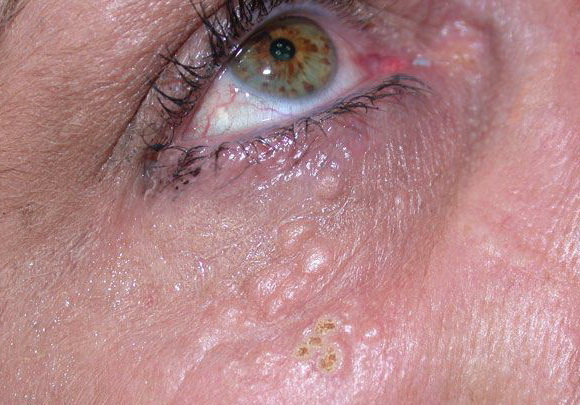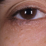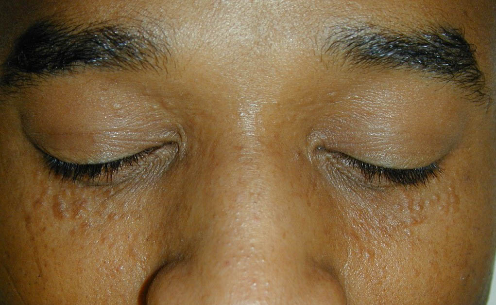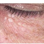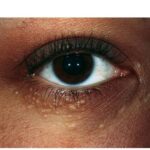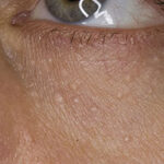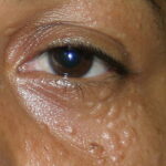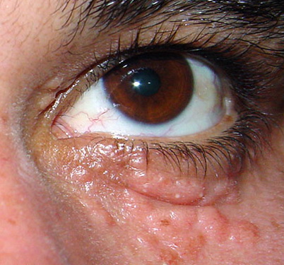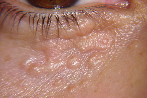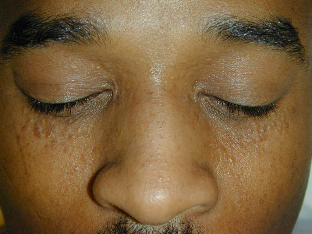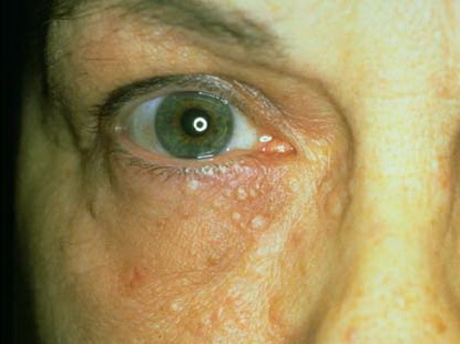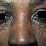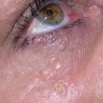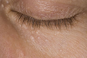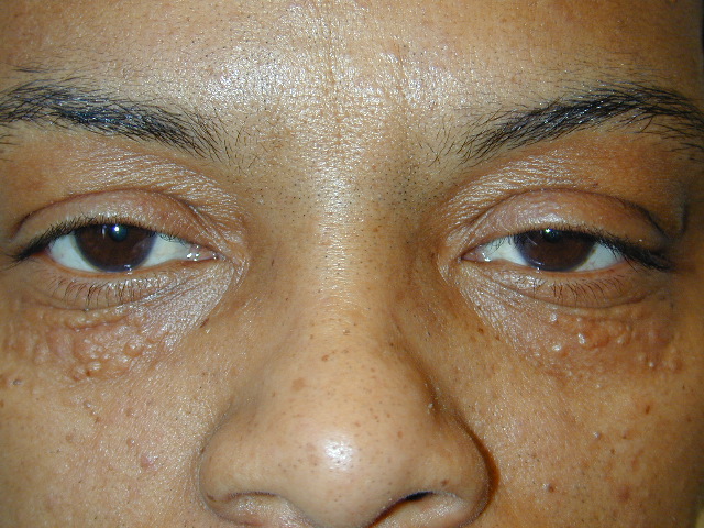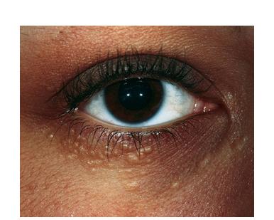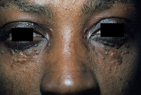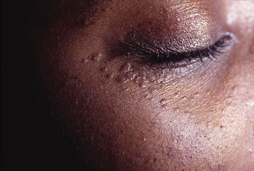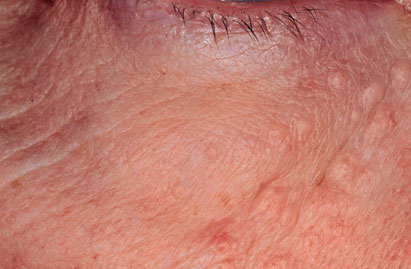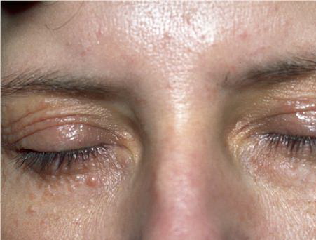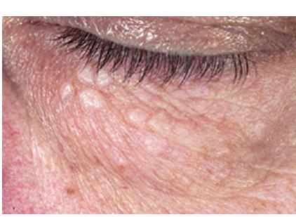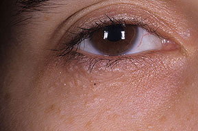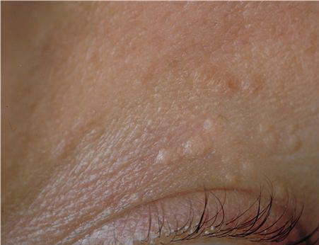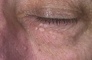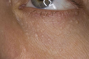 Clinical Findings. Syringomas present as numerous, small, firm, smooth, skin-colored, or slightly yellowish papules situated on the face, particularly around the lower eyelids of adults, but can develop in other anatomic sites. Women are more commonly affected. Scalp lesions often present as non-scarring alopecia. Syringomas occasionally show a unilateral, linear, or bathing trunk-type distribution. Familial cases have been recorded. There appears to be an increased frequency of syringomas in patients with Down syndrome. Eruptive syringomas represent a distinctive, occasionally familial form presenting mainly in pubescent or adolescent girls as successive crops of numerous, disseminated, sometimes confluent papules. These lesions tend to involve the upper half of the body, particularly the anterior aspect of the neck, chest, trunk, axillae, inner aspects of the upper arms, and umbilical area.