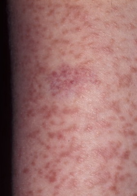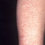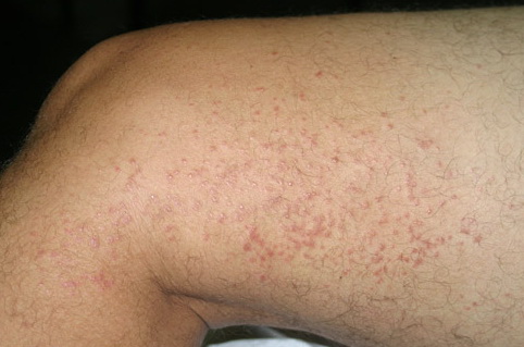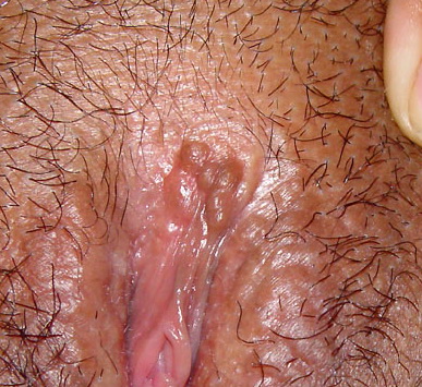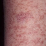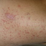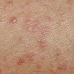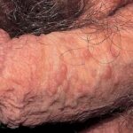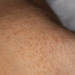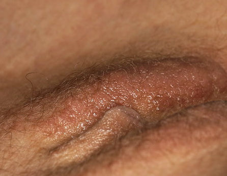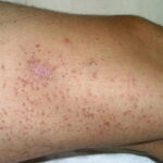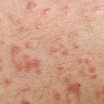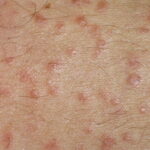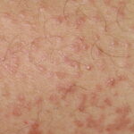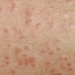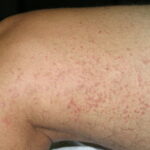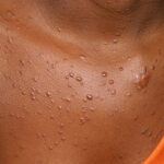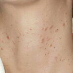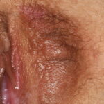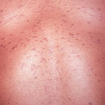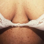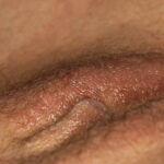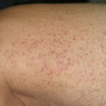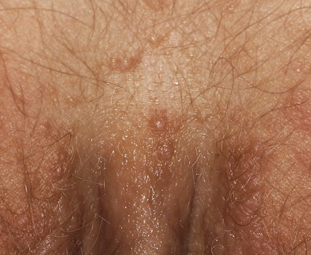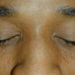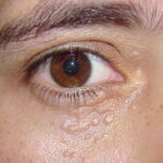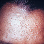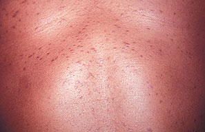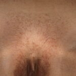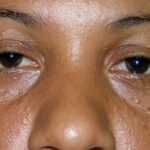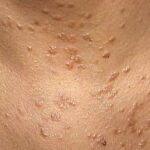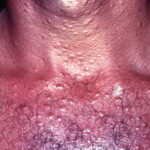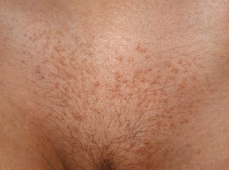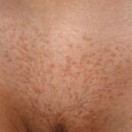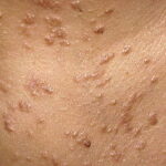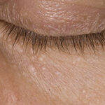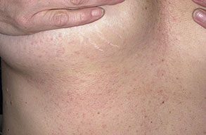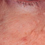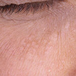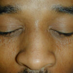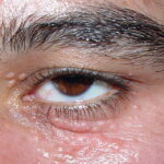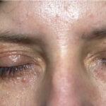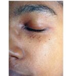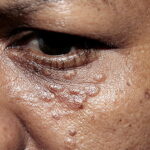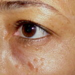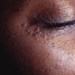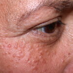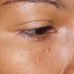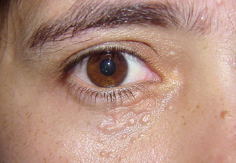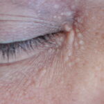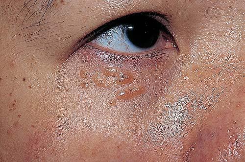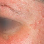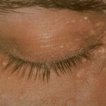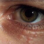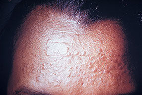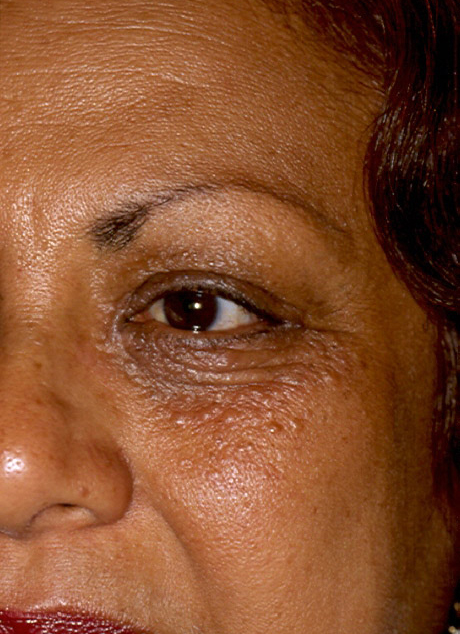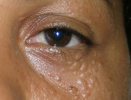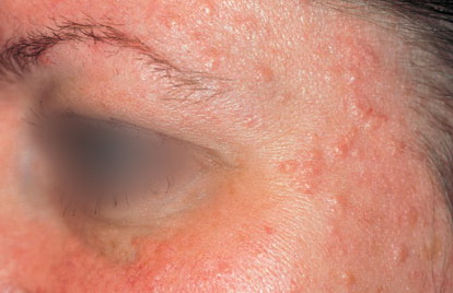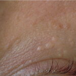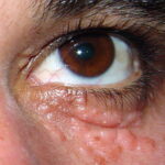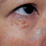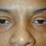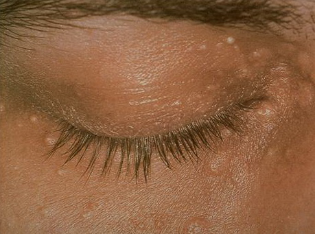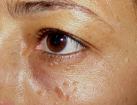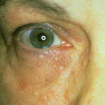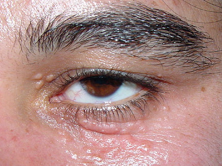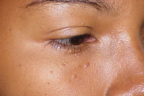 Clinical Findings. Syringomas present as numerous, small, firm, smooth, skin-colored, or slightly yellowish papules situated on the face, particularly around the lower eyelids of adults, but can develop in other anatomic sites. Women are more commonly affected. Scalp lesions often present as non-scarring alopecia. Syringomas occasionally show a unilateral, linear, or bathing trunk-type distribution. Familial cases have been recorded. There appears to be an increased frequency of syringomas in patients with Down syndrome. Eruptive syringomas represent a distinctive, occasionally familial form presenting mainly in pubescent or adolescent girls as successive crops of numerous, disseminated, sometimes confluent papules. These lesions tend to involve the upper half of the body, particularly the anterior aspect of the neck, chest, trunk, axillae, inner aspects of the upper arms, and umbilical area.